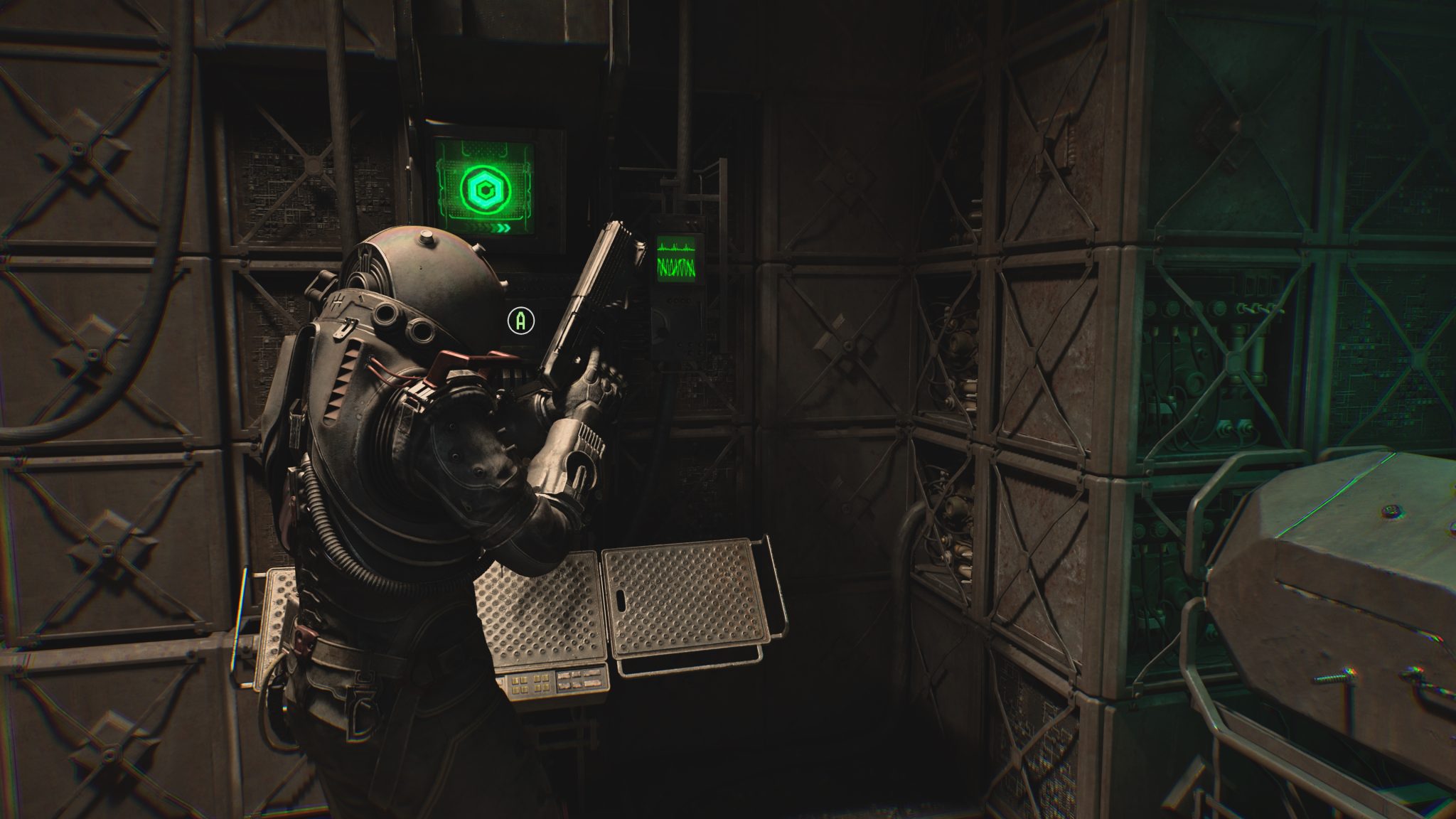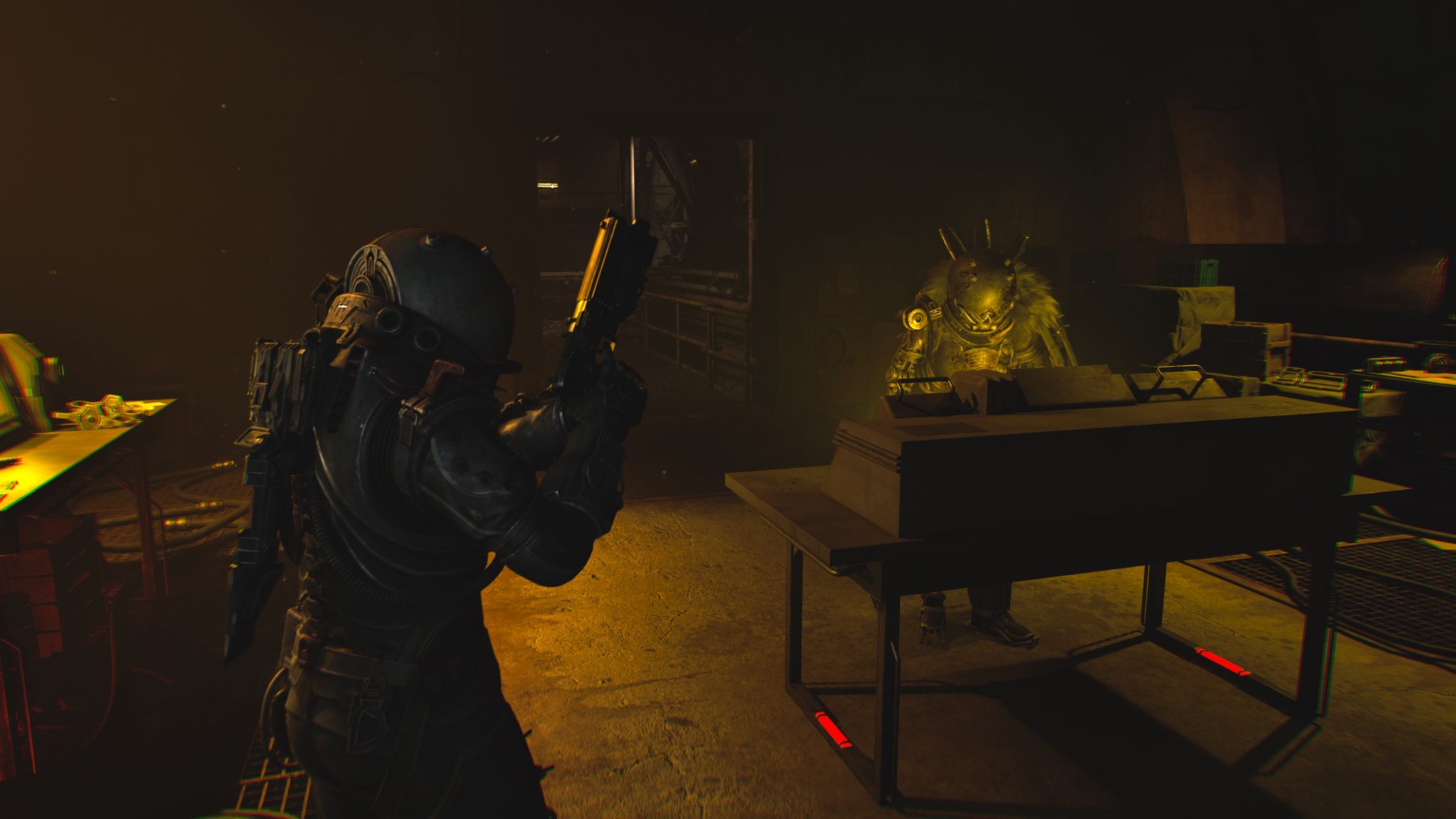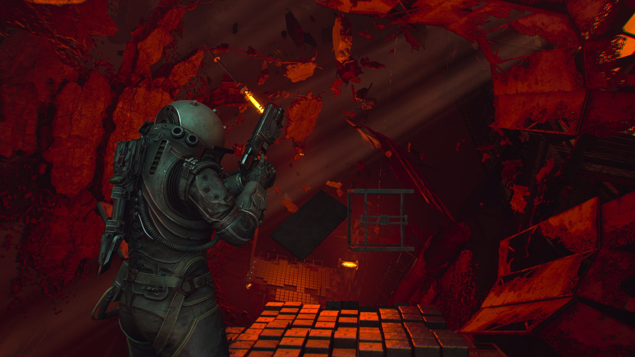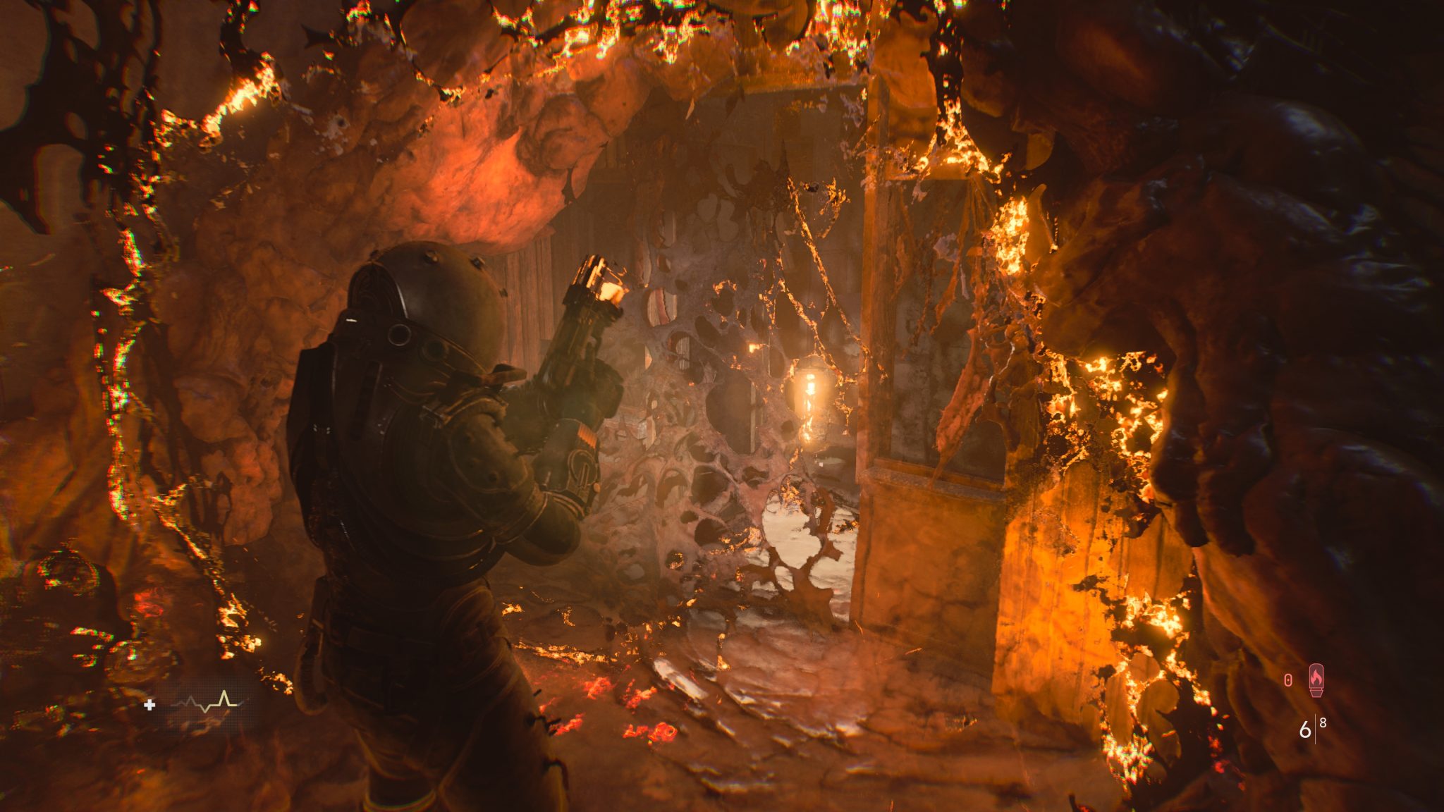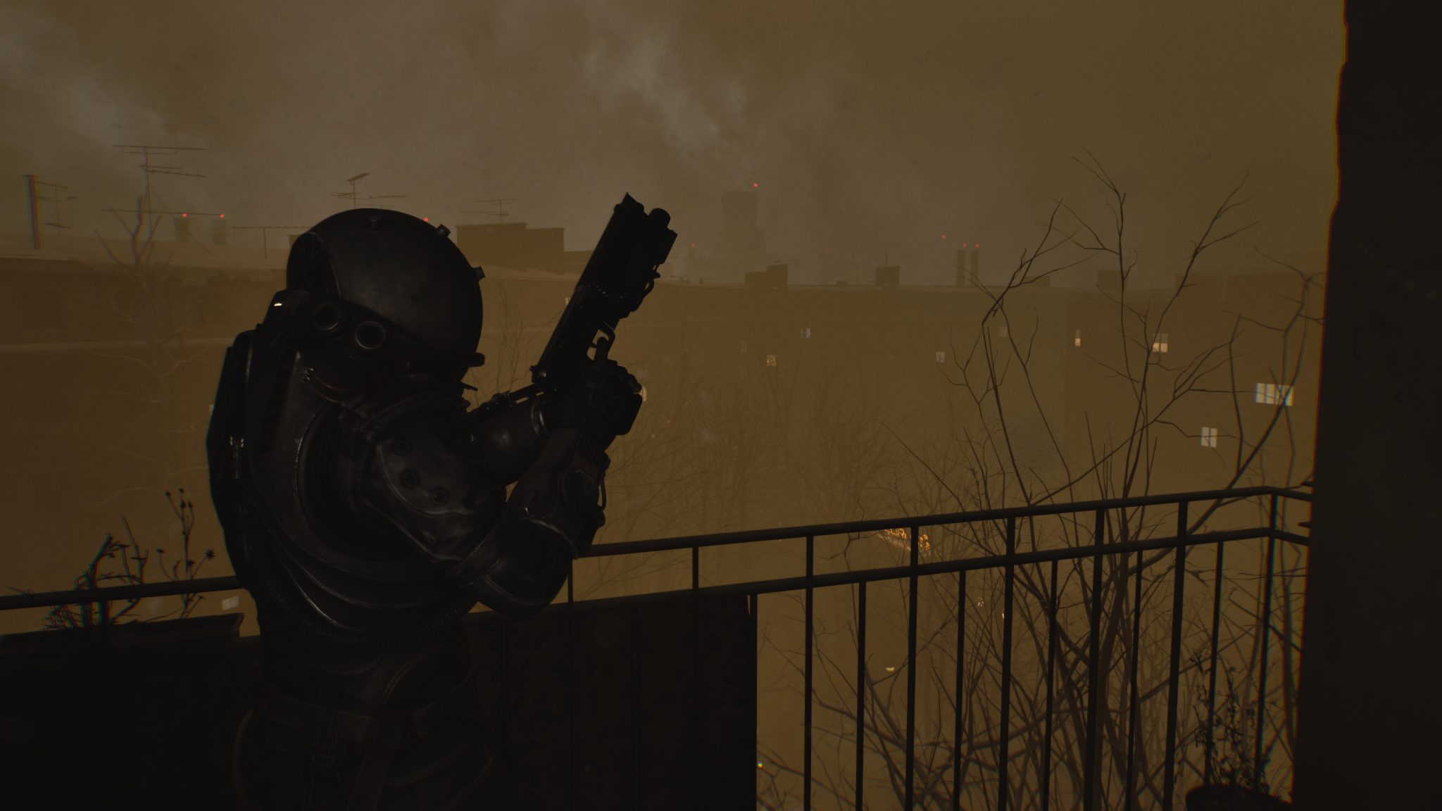 剛進入遊戲就能感受到壓迫的氛圍。霧霾壟罩的荒廢城市、坍塌的公寓大樓,製作團隊成功地把《沉默之丘》式的詭譎場景,搬進了科幻恐怖的框架裡。隨著探索逐步深入,風格也隨之轉變——屍堆組成的腐肉隧道、血跡斑斑的審訊室,甚至是時間靜止般的廣場,每一幕都像是把現實世界切開後,塞進一段夢魘般的幻象。