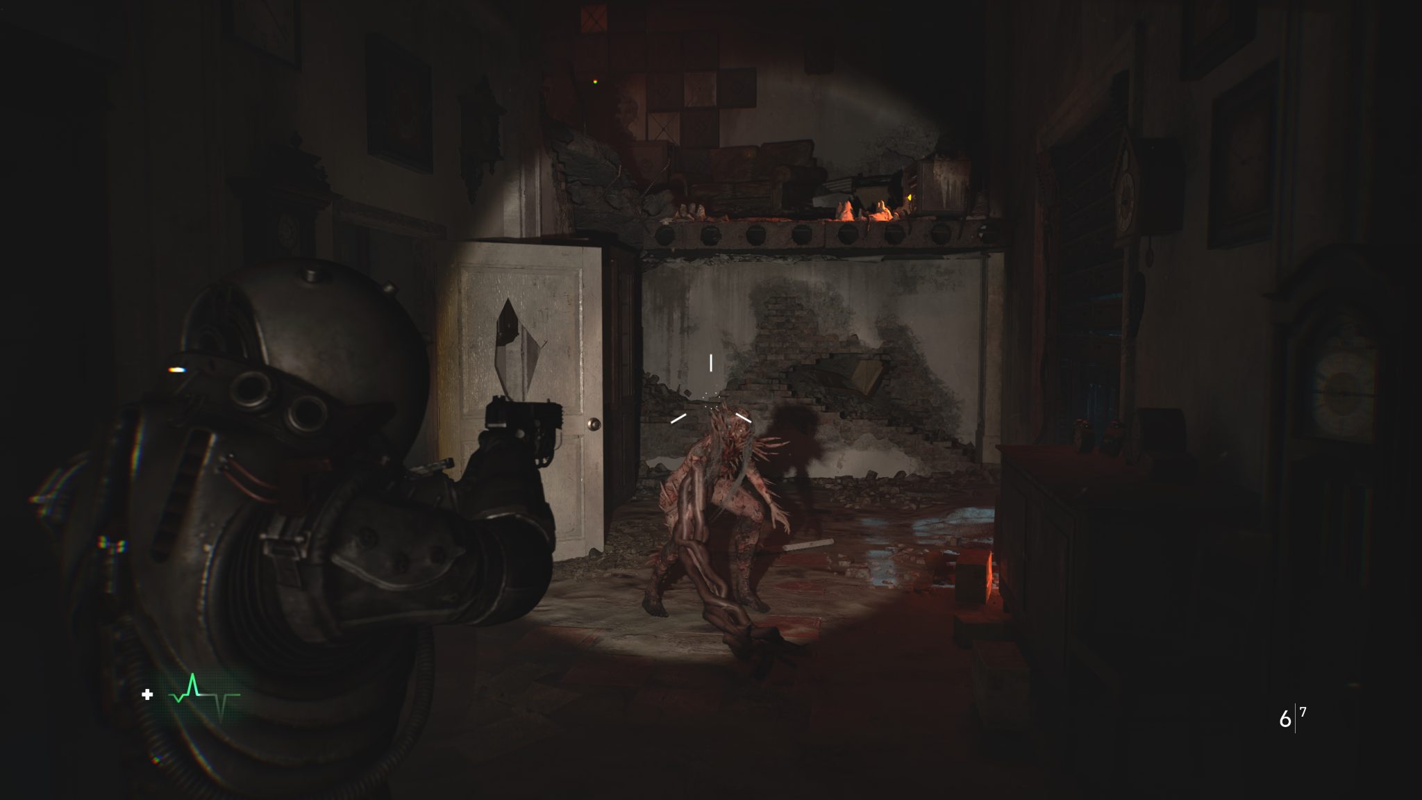 這樣的壓迫感並不只來自場景,敵人出現時更是直接把緊張推到頂點。戰鬥設計的核心思路是集氣射擊跟爆頭。近戰攻擊幾乎沒有傷害,只能當背包圍時的掙脫手段。敵人的特色是會與地上的屍體融合,融合後,外觀就會長出一層層硬殼防護。這些硬殼幾乎能抵消正面傷害,迫使玩家必須鎖定脆弱部位,才能快速解決威脅。