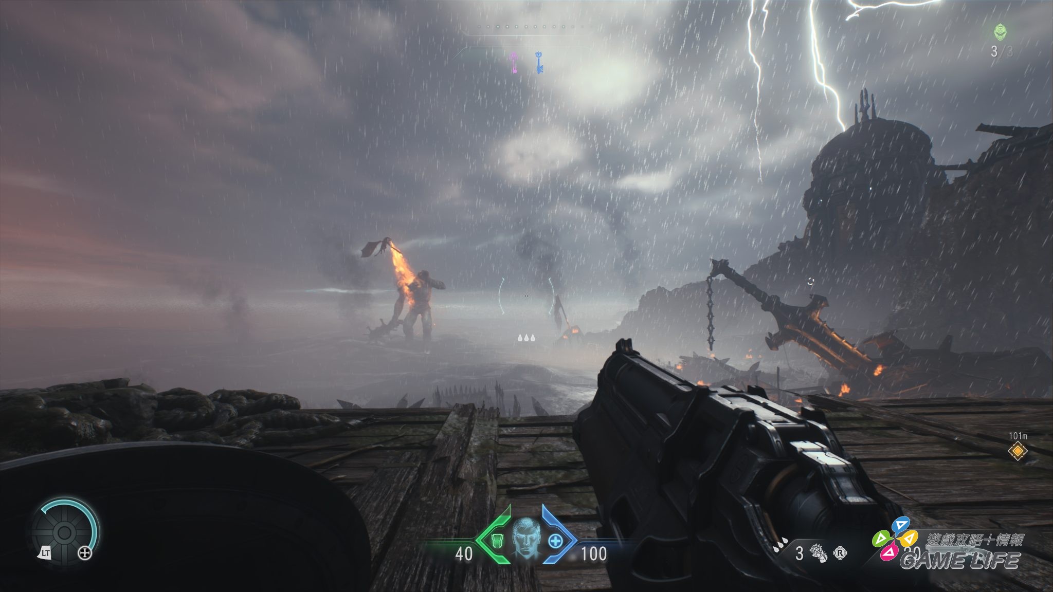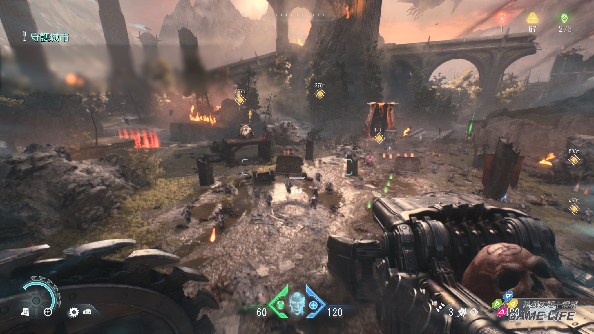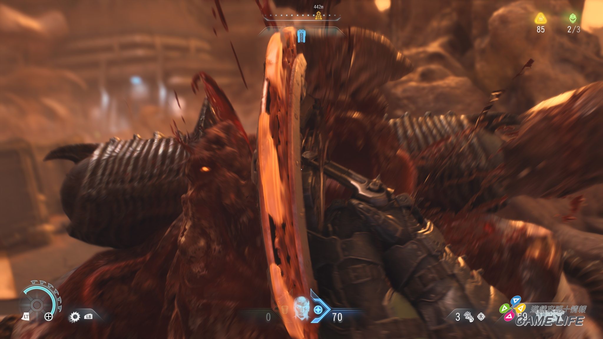 最令人驚喜的,是本作核心武器「盾牌」的登場。這是個防禦與攻擊兼具的殺器:能格擋、反擊、衝撞、投擲、擊暈,配核武器用還能引爆敵人。當我第一次扔出那面帶鋸齒的盾牌,整排小怪像保齡球瓶一樣飛散出去,我腦中只剩兩個字——「爽爆」。