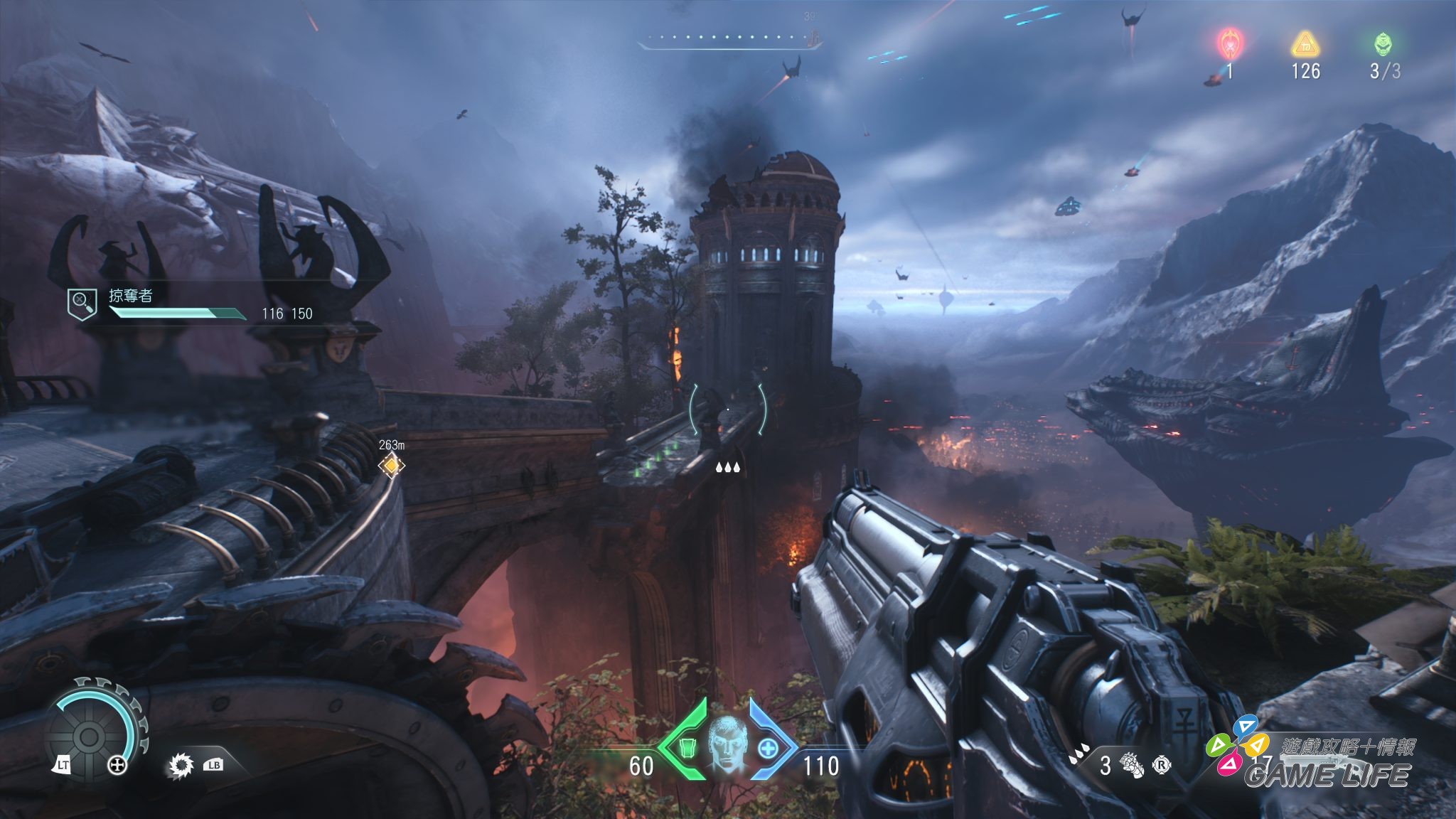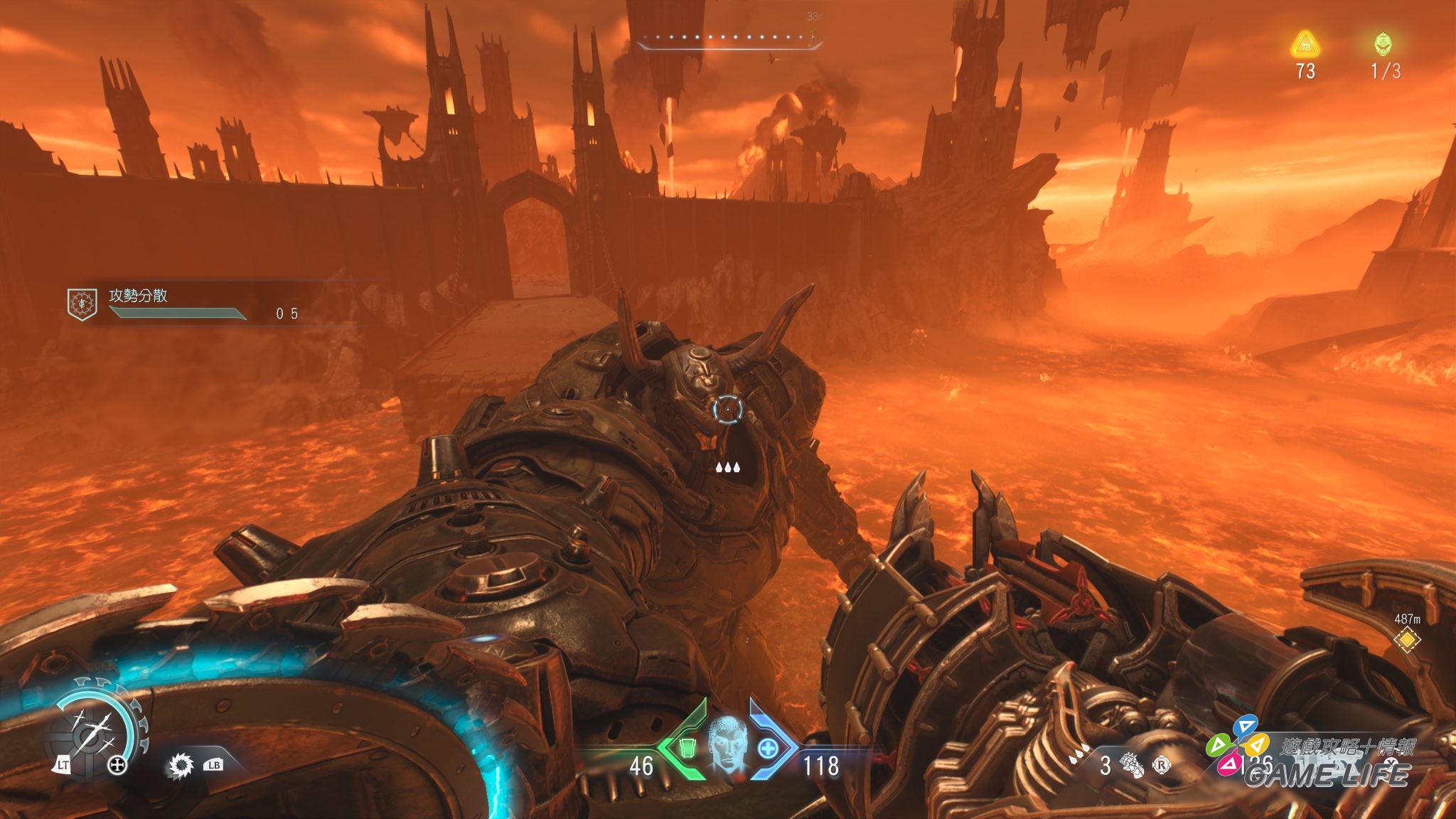 這次的關卡設計有著明顯的佈局改變,不再追求錯綜複雜或密集狹窄的走廊戰,而是以更宏觀的地形分區,營造出強烈的縱深感與侵略感。你一步步深入惡魔的堡壘,穿越被屠城的村鎮、爬上滿佈枷鎖與鐵鍊的煉獄高塔。每張地圖都有清晰的主視覺設計與導引路線,讓探索過程既不迷失也不無聊,視覺風格與地形佈局交織成極具壓迫感的殺戮舞台。