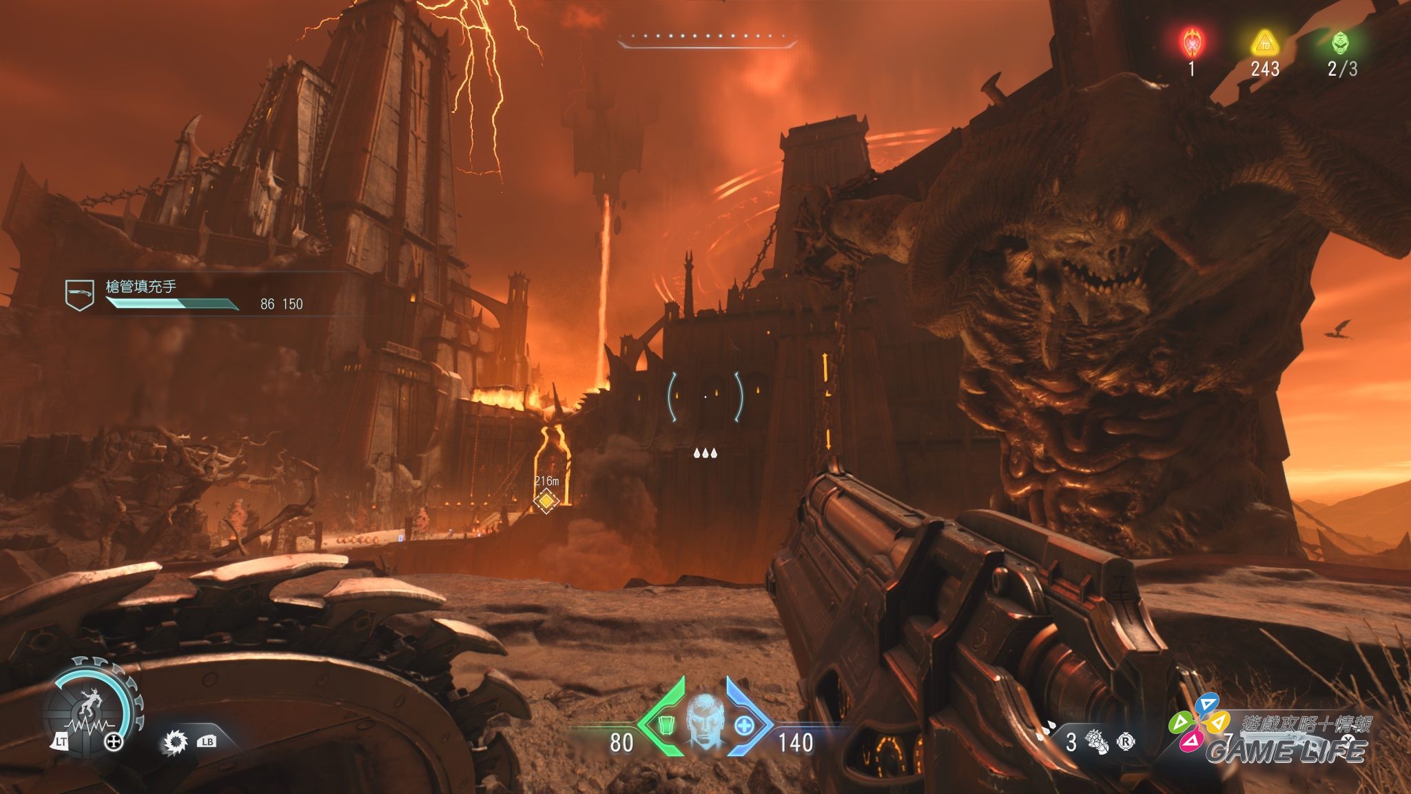 噴發器與連鎖槍是本作中最具風格、也最令人上癮的兩把武器。噴發器簡直是黑色幽默的極致體現——它的子彈不是金屬彈殼,而是敵人的頭骨。你親手把惡魔變成彈藥,接著再用他們的骨頭打爆下一個倒楣鬼。這種近乎變態的設計充滿瘋狂美學。發射時的聲響與骨骼碎裂的打擊感極其痛快,成了我清怪時最愛的娛樂武器。