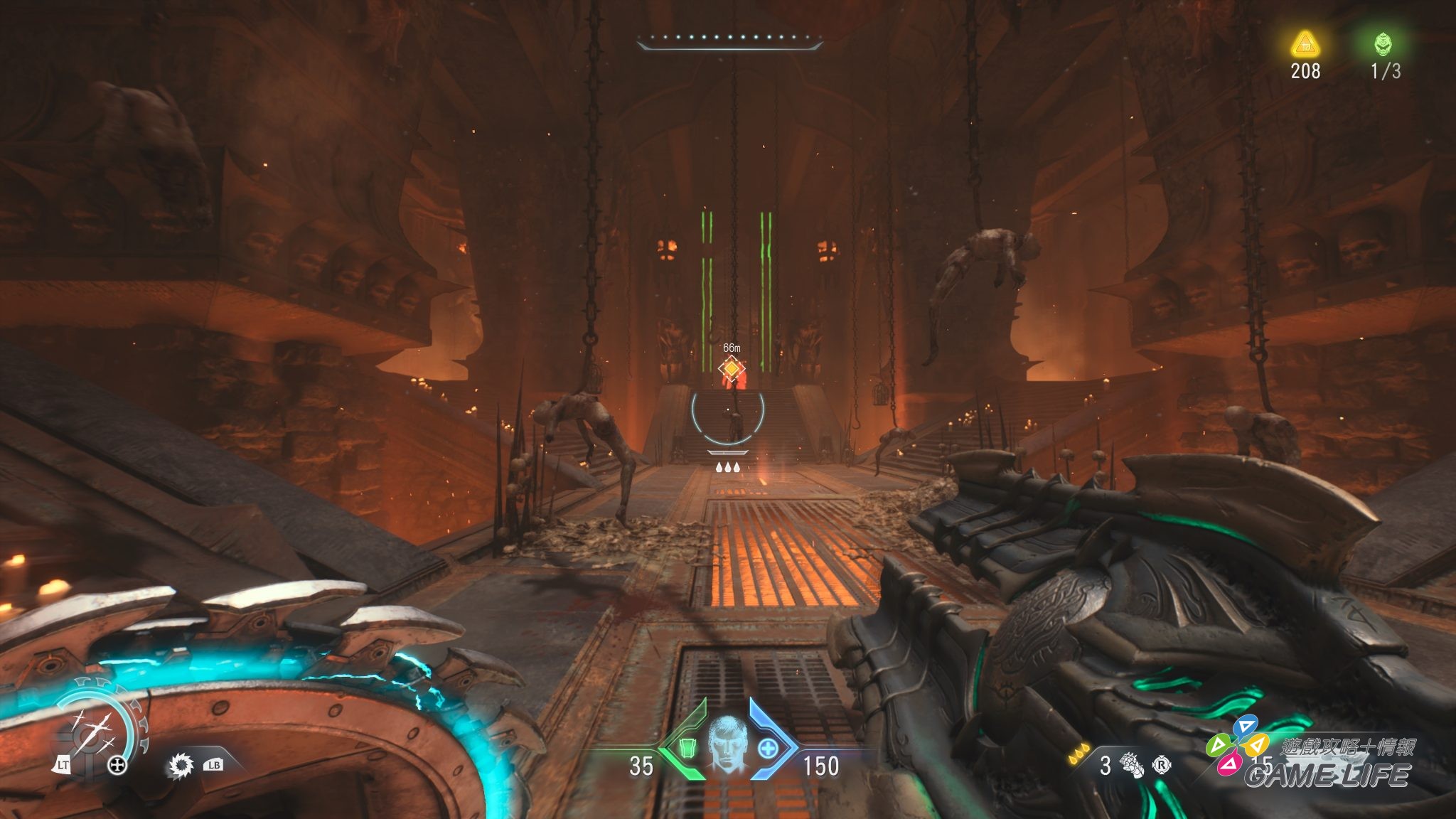 除了殺戮本身,關卡與美術則替這場煉獄添上厚重的背景。《黑暗時代》的整體風格從《永恆》的科幻地獄大幅轉調,轉向一種中世紀奇幻與血肉機械混種的哥德式景觀。滿地的鐵鏈、枷鎖、燃燒的煉爐與被肢解的巨魔,營造出一種接近「中世紀地獄美學」的視覺衝擊力。