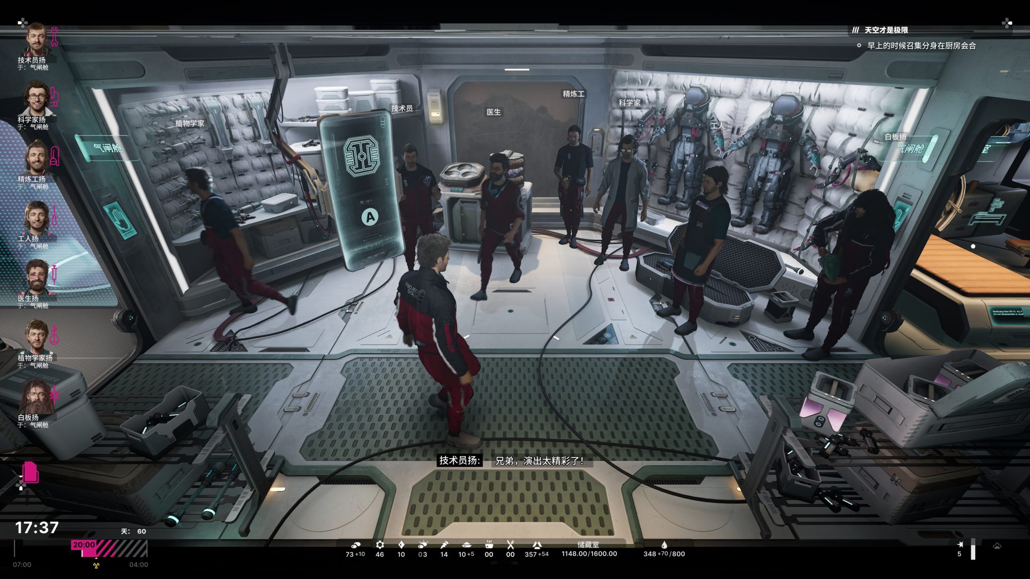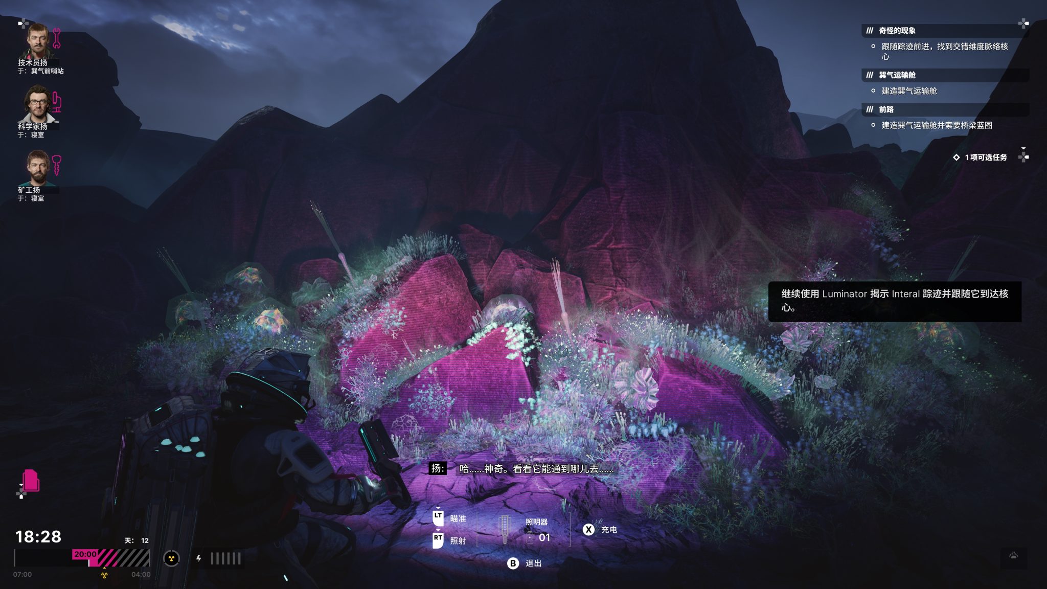 遊戲的核心系統其實是時間資源管理。白天需要精準分配分身的工作——誰去採礦?誰修復基地?誰耕種?還能冒險外出,搜尋被恆星灼燒前的寶貴資源。入夜後因輻射威脅,所有人只能留在基地,此時便是處理情緒與人際衝突的時機。