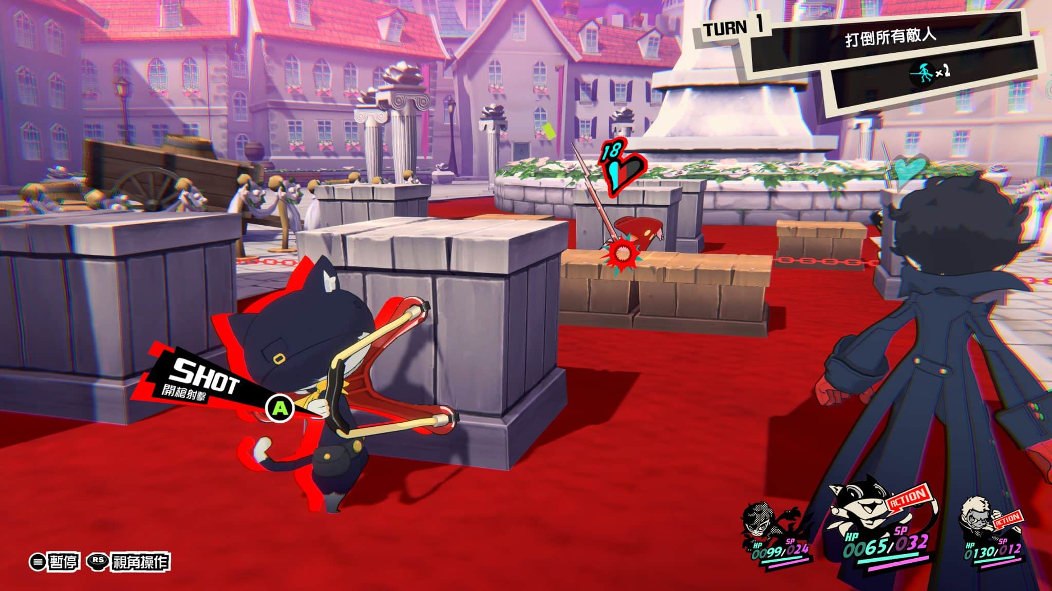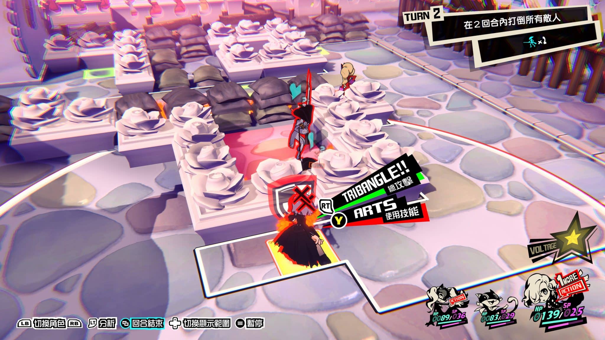 總攻擊則需要兩項條件。一名角色在 1 More 的狀態,三人圍成的三角形中有倒下狀態的敵人。所有被包圍的敵人都會受到極高傷害,而且發動總攻擊只會消耗 1 More 角色的行動次數,其他角色還能繼續行動。如果搭配的夠好,一回合三次總攻擊都不是問題。