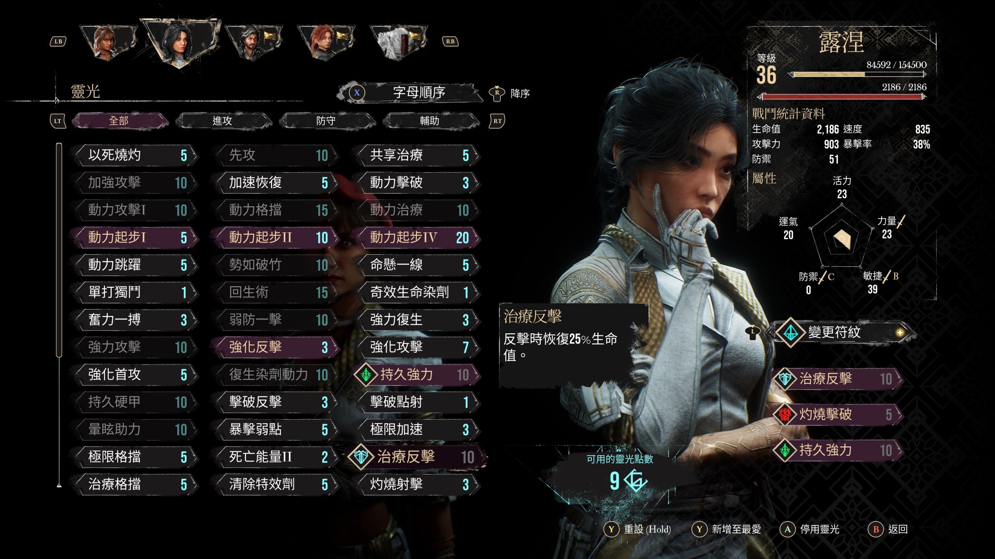 角色成長遊戲也給足的空間。我們能透過符文學習被動技能,裝備被動技能則要用到「靈光」,靈光可以向商人購買,探索地圖,或是打敗敵人獲得。這些技能不只提供數值加成,更能大幅影響角色的行動機制,比如獲得 AP 的方式、閃避與格擋後的額外效果,甚至是對異常狀態的應對。