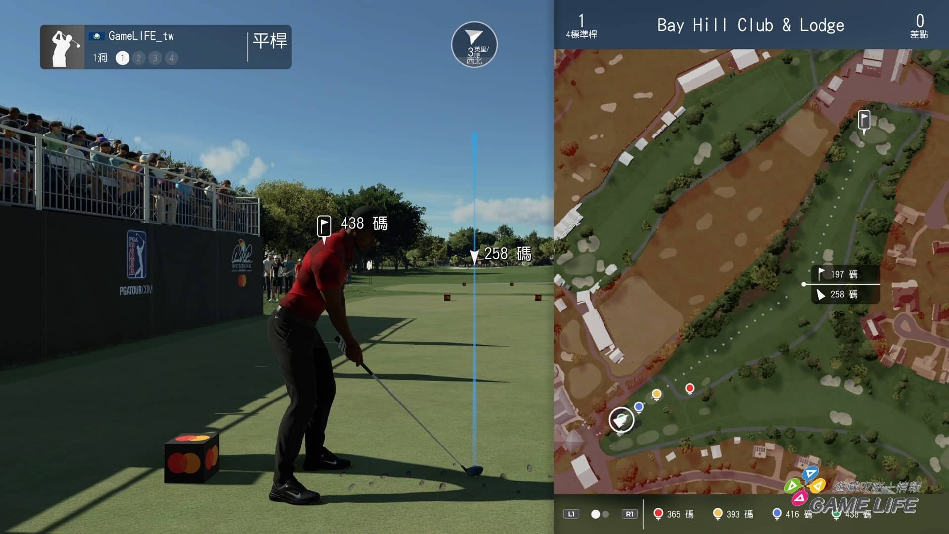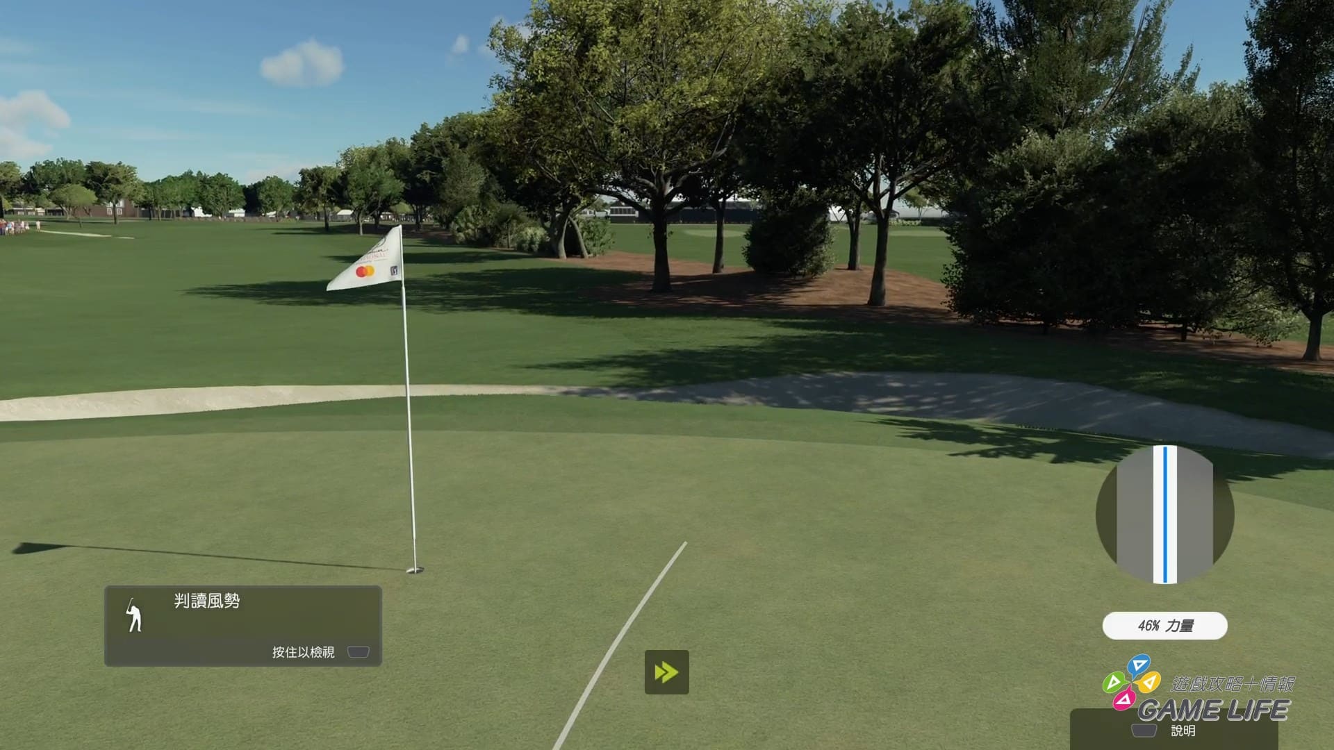 畢竟是遊戲,實際球賽不用像現實選手那樣完全自己靠雙眼雙腳評估,遊戲中一顆按鈕隨時都可以觀看球場全面地圖,了解球場的構造跟路線,上果嶺後,也會有風向標示與斜坡表示,讓玩家推測球推出後會怎麼滾動。而且上果嶺後一次推桿可以使用一次球路預測,對調整推球方向非常方便。