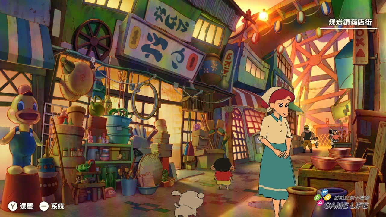 但說真的,如果是要享受《蠟筆小新》外傳作品特有的精彩冒險故事,那麼鄉村的確不是重點,鄉村 Part 就是讓玩家悠哉地體驗各種鄉下小樂趣;整個作品的故事中心還是在煤炭鎮的部分。小新只要來到煤炭鎮,就要負起保護煤炭鎮的期望,四處奔波收集道具,有時讓餐廳老闆娘作作料理、有時讓發明家創作點新道具等,與煤炭鎮的人們建立羈絆,並捲入一場更大規模的風波。