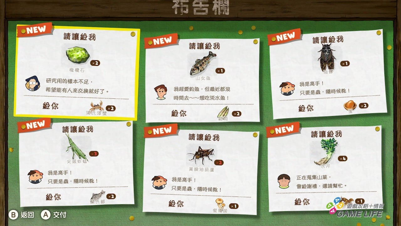 前面也講到本作可以玩得相當地悠哉,所以不會像《蠟筆小新 我與博士的暑假 永不結束的七日之旅》需要一直煩惱時間的控管,本作比較需要掌握數量的是素材跟金錢。為了解決許多人的委託,小新要沿路收集、購買、交換各種材料,例如用魚換礦石、用獨角仙換錢再去市場買東西等等,必要時可能還要一些地方重複來往,看看能撿的素材是否會重生。