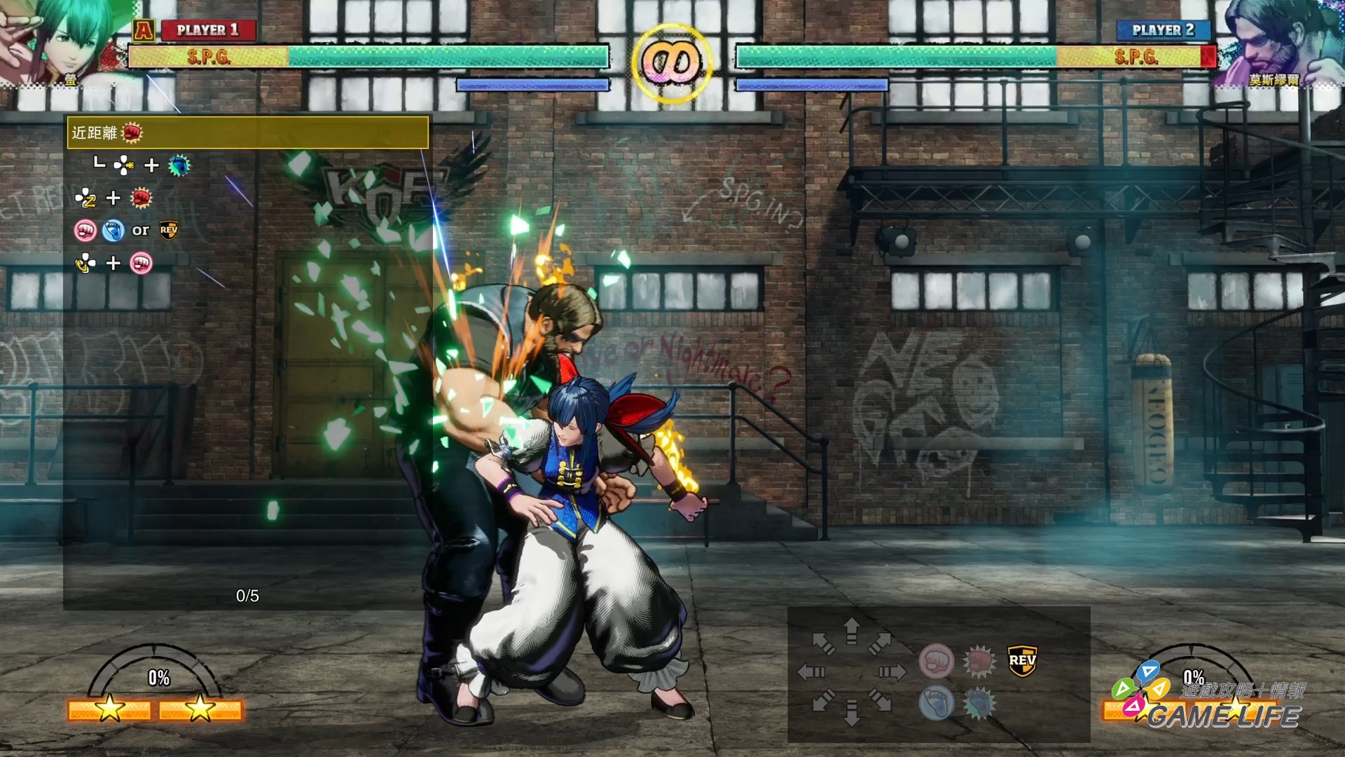 REV 計量表主要會因為兩種行動累積,在 S.P.G. 狀態下特定兩顆鈕一起按,不論地上都是空中皆能發動的強力攻擊,REV 攻擊。REV 攻擊以綠色光芒呈現,能夠硬扛敵人的部分攻擊出手。本作的簡易連段系統,多半是特定按鈕連著按成立簡單的拳腳連續攻擊(因應角色不同按鈕也不同),然後多半可以用 REV 攻擊收尾,當然也能不用 REV 攻擊改用特定指令技,這部份就關係到本作的連段概念,後面再說。