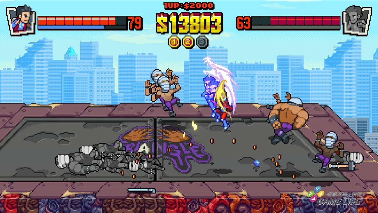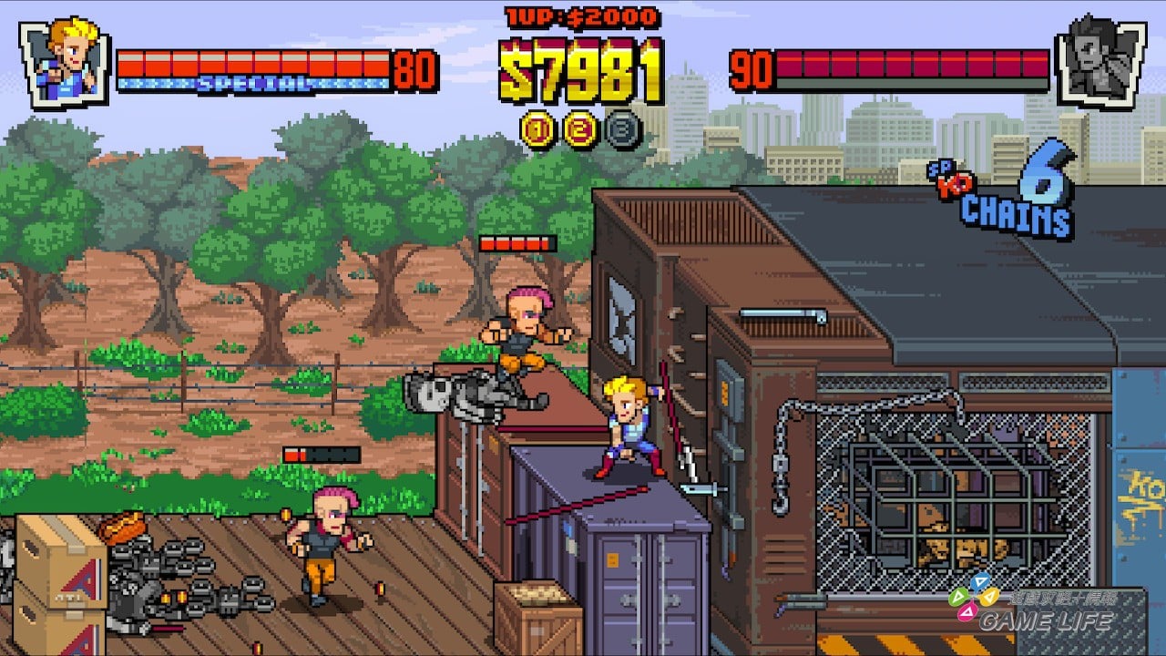 歷代主角的比利、吉米兄弟看起來也跟以往差蠻多,一個正經一個屌兒啷噹,再配上一些特效的表現,只能說這就是「現代風格」的《双截龍》吧。不過要說遊戲手感,製作團隊倒是很了解《双截龍》打起來的感覺。有玩過過去系列都知道,《双截龍》的手感有一個特色就是玩家輸入指令後,人物動作並不會很敏捷地反應,而是流暢動作但又有點慢速地一拳一腳,藉此表現本作拳腳扎實的打擊感。