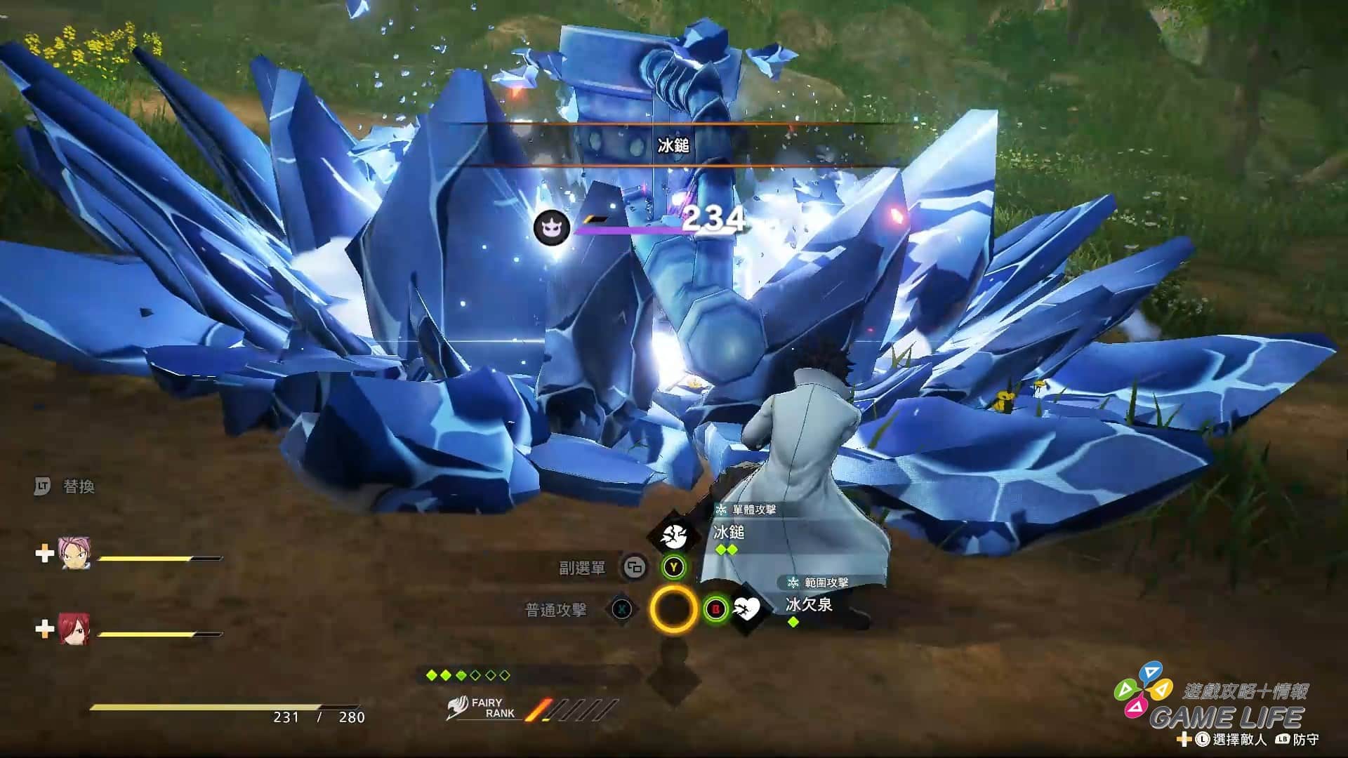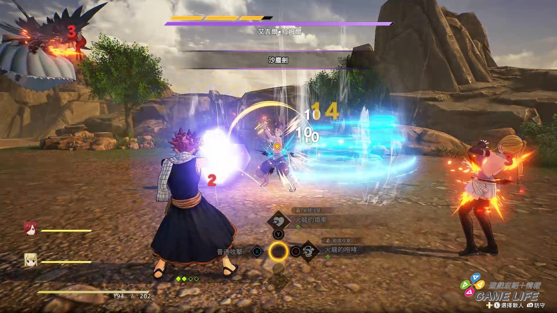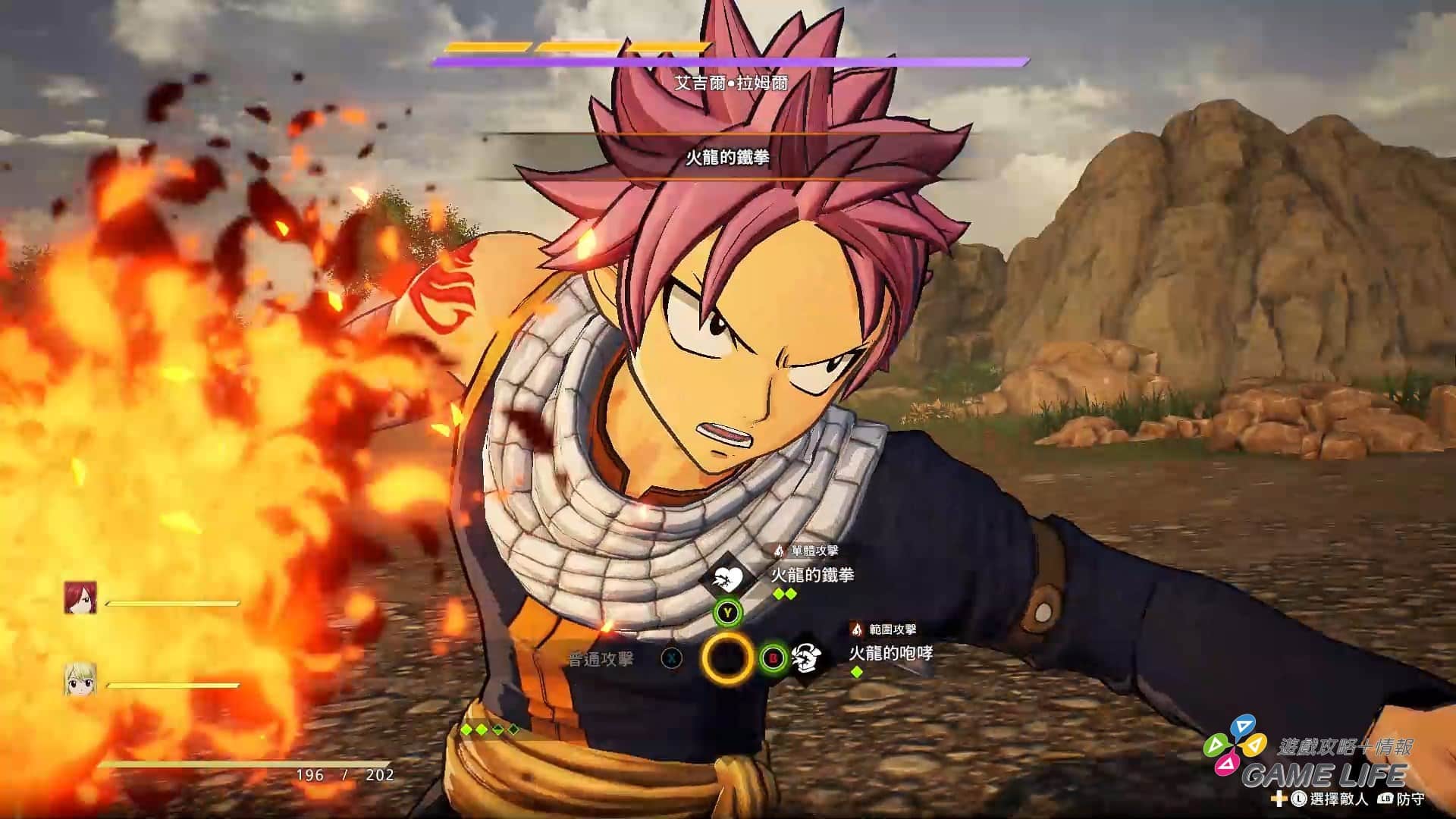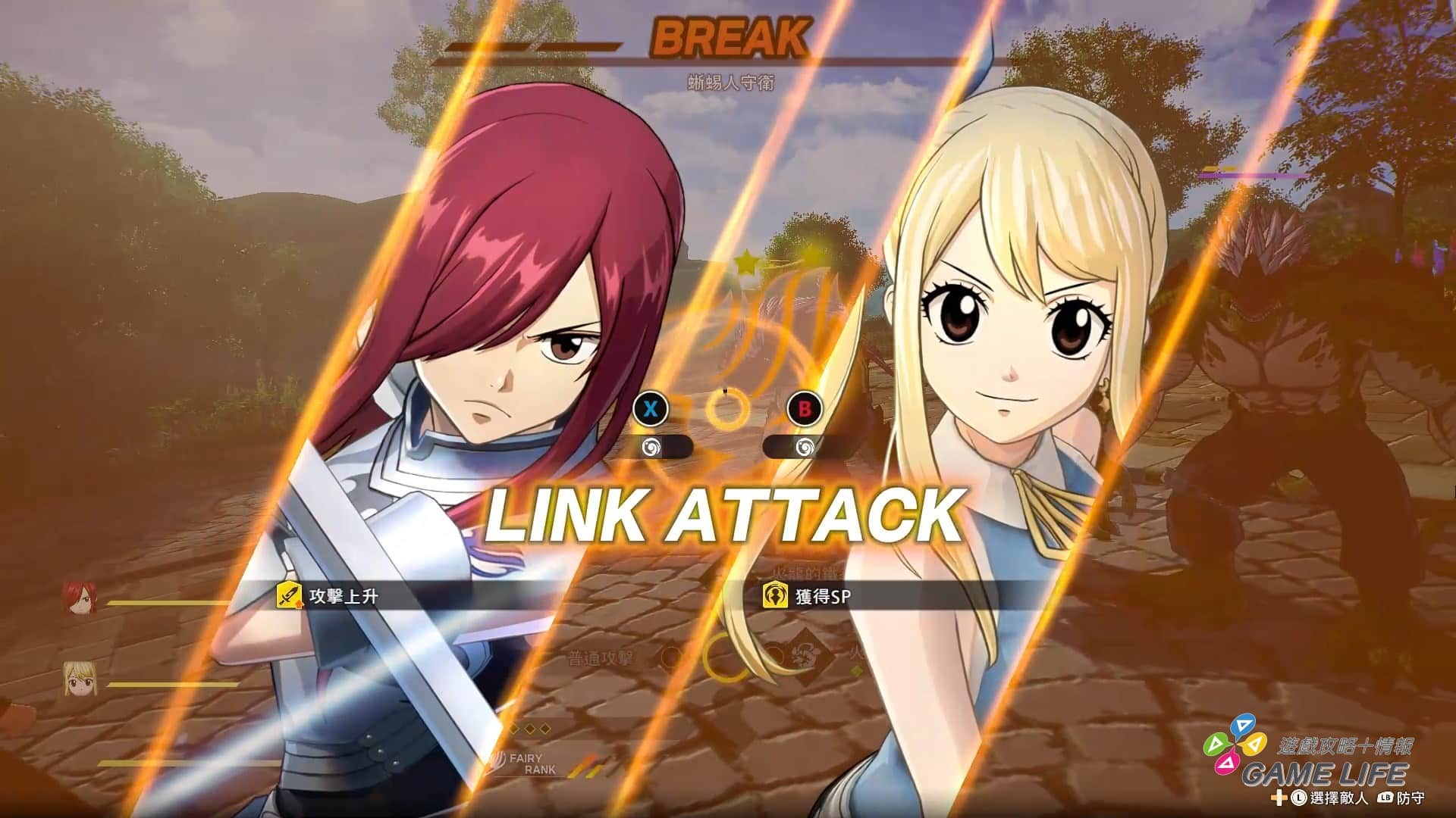 FAIRY TAIL 公會幾乎大家都有各自的攻擊屬性,針對敵人的弱點屬性對症下藥算是面對強敵非常重要的概念。敵人除了基本攻擊外,有頭有臉的人物都會有強力的絕招,系統也會通知玩家說敵人要放大絕招了,這時可以看到敵人圍著一圈發動計量表,玩家必須用該敵人的弱點屬性去攻擊,才能削減該計量表,進而削光阻止危險的大絕招發動。