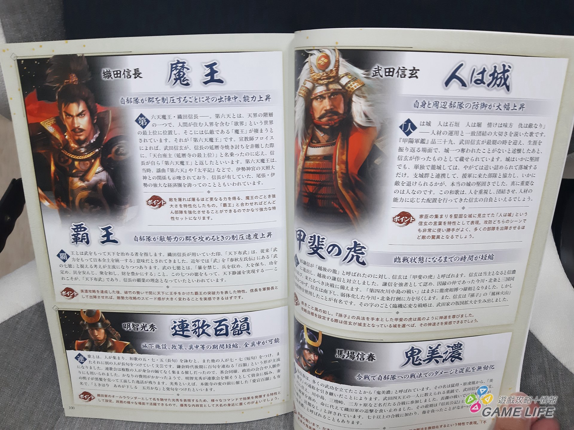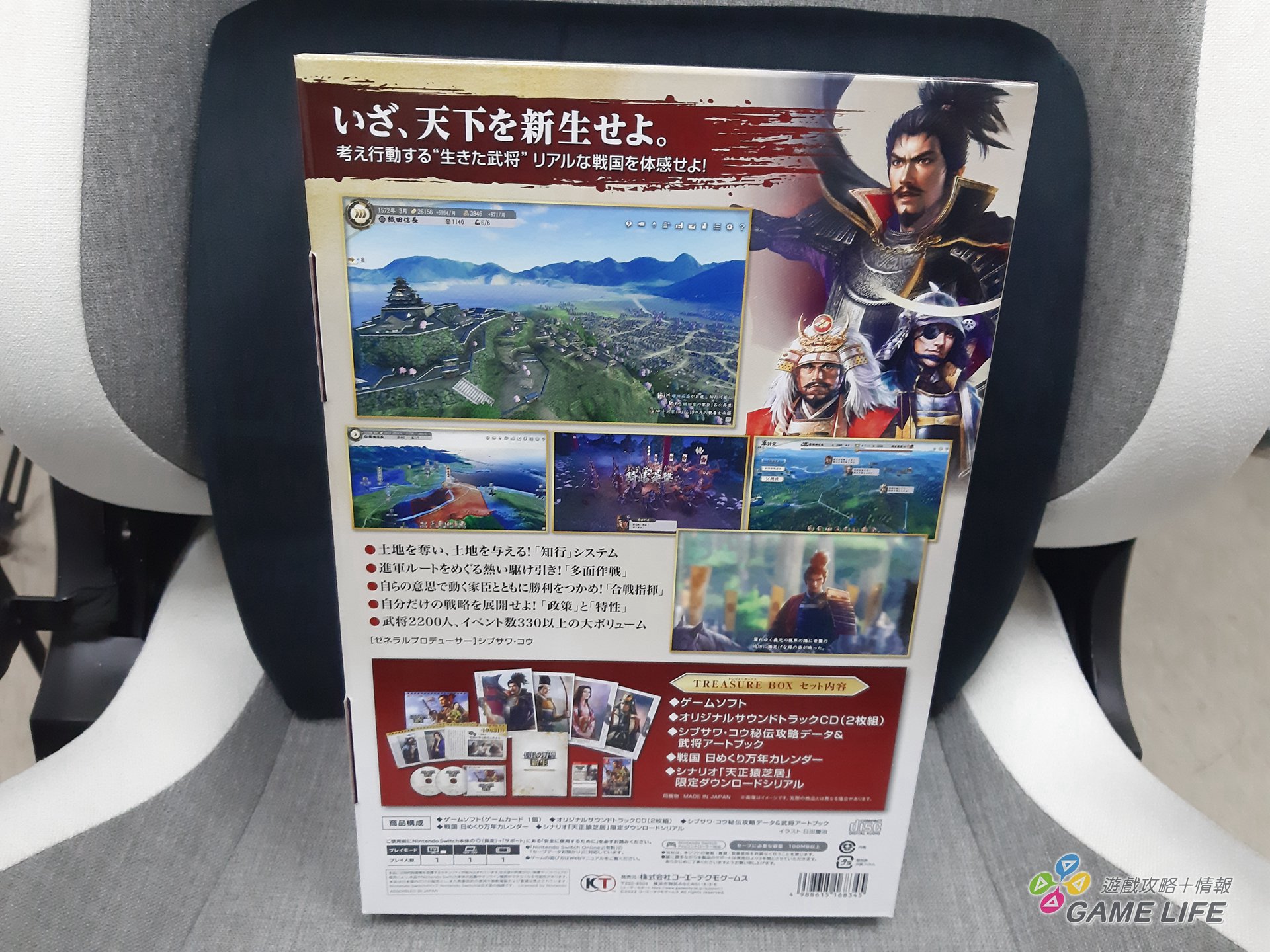 最一開始先來介紹一下本作的限定版,擁有豪華內容的特典版向來是光榮特庫摩作品的特色。這回就算是 Switch 版也是相當大一盒,符合標題,封面以織田信長的勢力為重點構成,封底則可以看到織田信長、武田信玄、伊達政宗三人跟本遊戲特色。當然,這幾位歷史名將在光榮特庫摩作品底下的造型也是相當固定了,很多人一眼就能認出來。
