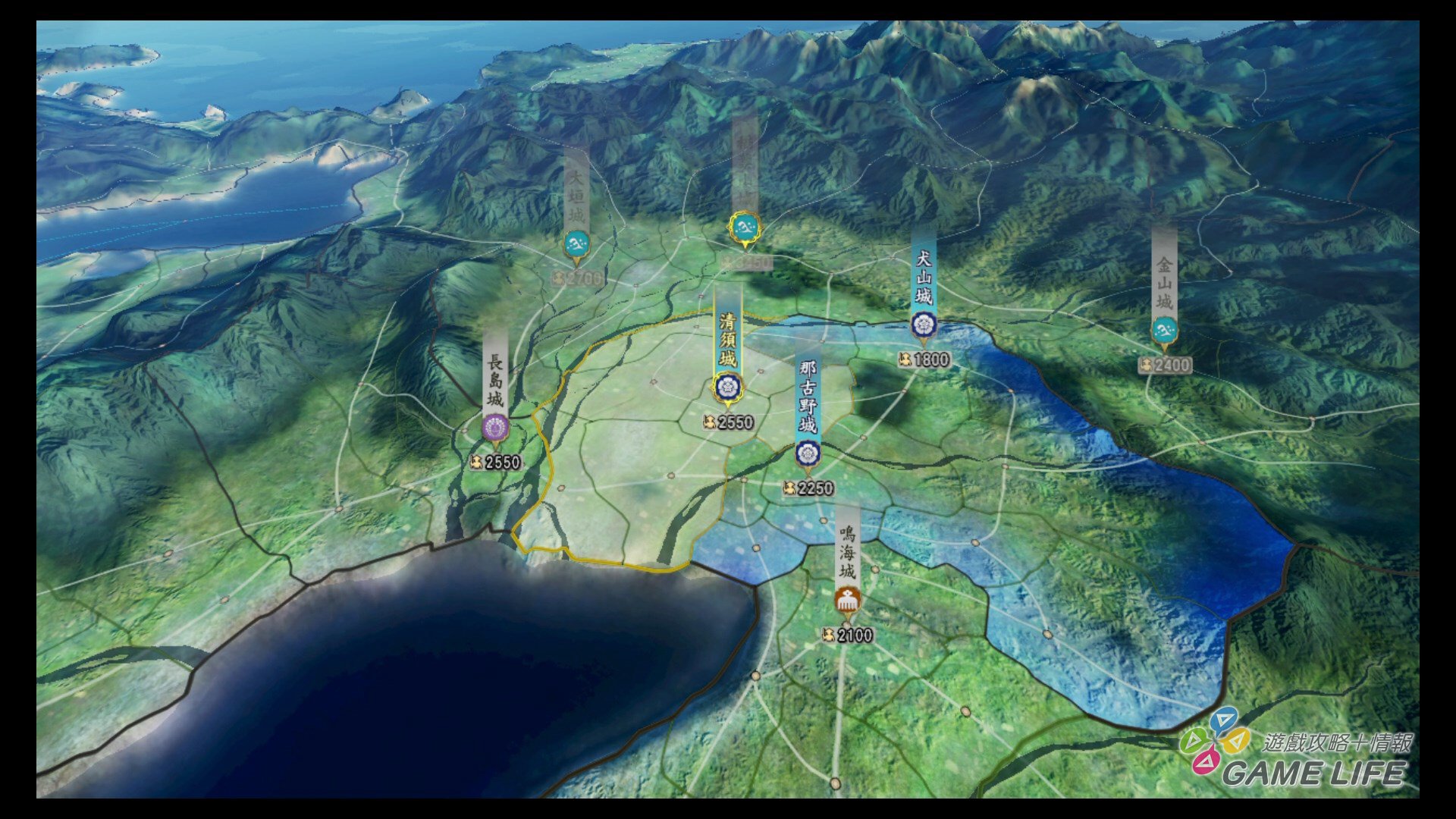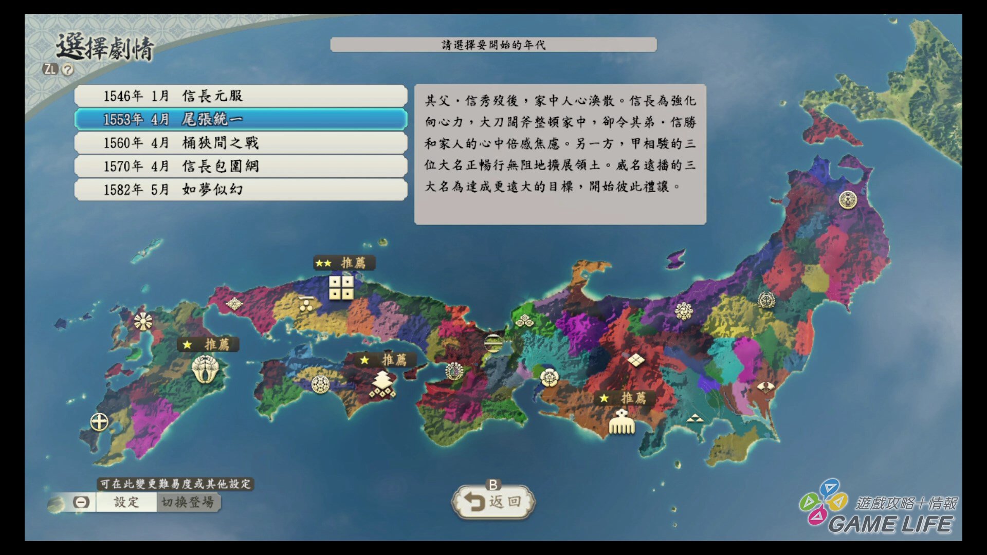 遊戲一開始可以從 5 個年代挑選一個、再從該年代的各勢力中挑選一個出來遊玩,不管從何選起,一開始都會有簡單的教學模式指導玩家遊戲的主要進行方式。首先會進行「知行」指令,這就會帶到本作最核心的一個地方,這次的日本是由「郡」構成,幾個「郡」變成一個「城」,內政管理就以「城」為單位進行。