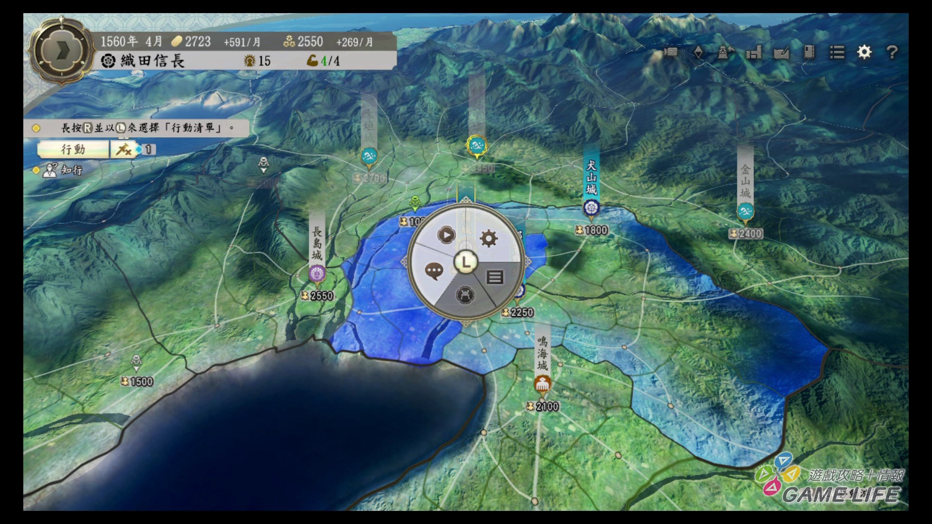 另外有一個原因就是這次操作介面大幅度的更改,以前的介面設計都偏向電腦遊戲的概念,選單集中在左側或右側,再一一確認可以做的事去下指令。這次則是改成滾輪式選單,在大地圖畫面按下指定按鈕就會於畫面中央開啟一個圓形選單,圓形選單每一個選項則會在擴充出去其他選項,設計概念上像織田家家紋,看起來是有點帥氣,不過因為按鈕配置跟以往有不小的差異,家用主機版玩家無論如何都需要時間去習慣。