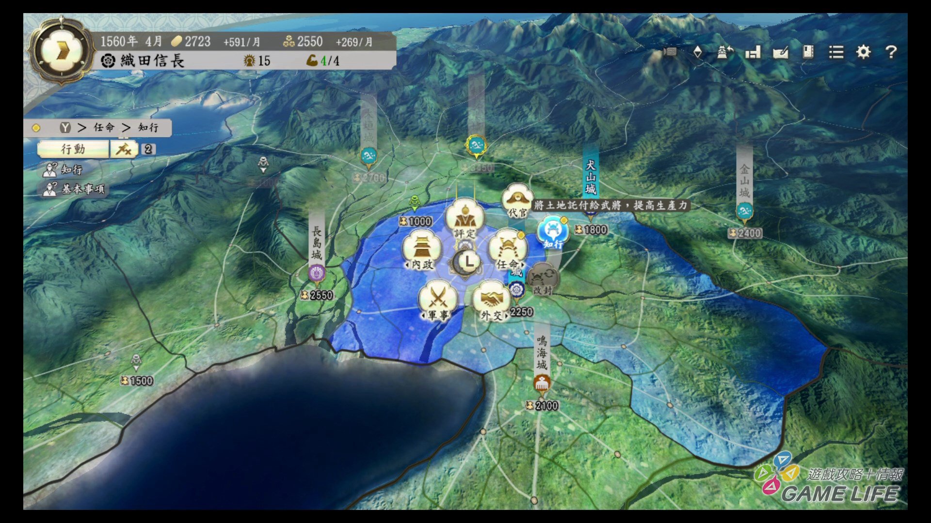 「郡」與「城」就是一個勢力的代表,也就是領土。所謂的「知行」,就是分配工作跟管理區域,城主專心「城」的發展、「郡」的管理者也自己處理自己的「郡」,成果再合併起來變成勢力的發展。也就是說,這次一個勢力因為有很多「郡」與「城」,因此每一個都必須配置角色,讓他們去自行發展,當然角色有著忠誠、統率、武勇、知略、政務等能力值與特技,要如何適才適所去分配人員,將各區域發展出玩家希望的成果,就考驗玩家的判斷力跟觀察能力了。