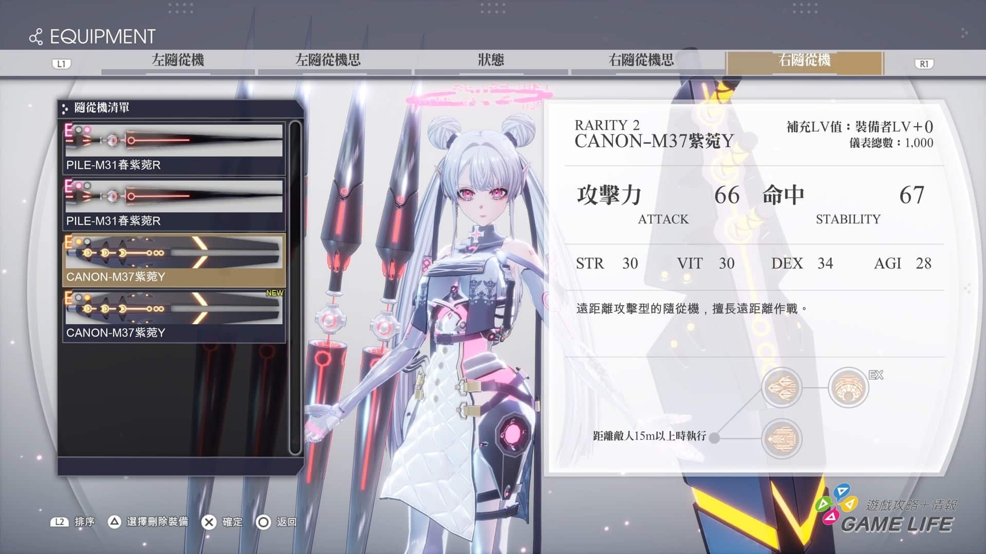 另外就是我方角色裝備除了武器以外,還有左右兩側的子機可以挑選裝備。每種子機增減人物能力的數值與功能都不同,戰鬥中玩家可以用 L、R 鈕來下令子機動作,發揮攻擊、妨礙等多種功能,因為是機器,所以子機使用後就是等待冷卻時間回復就能再使用。這個設計就可以說非常有在操作機器人的味道。