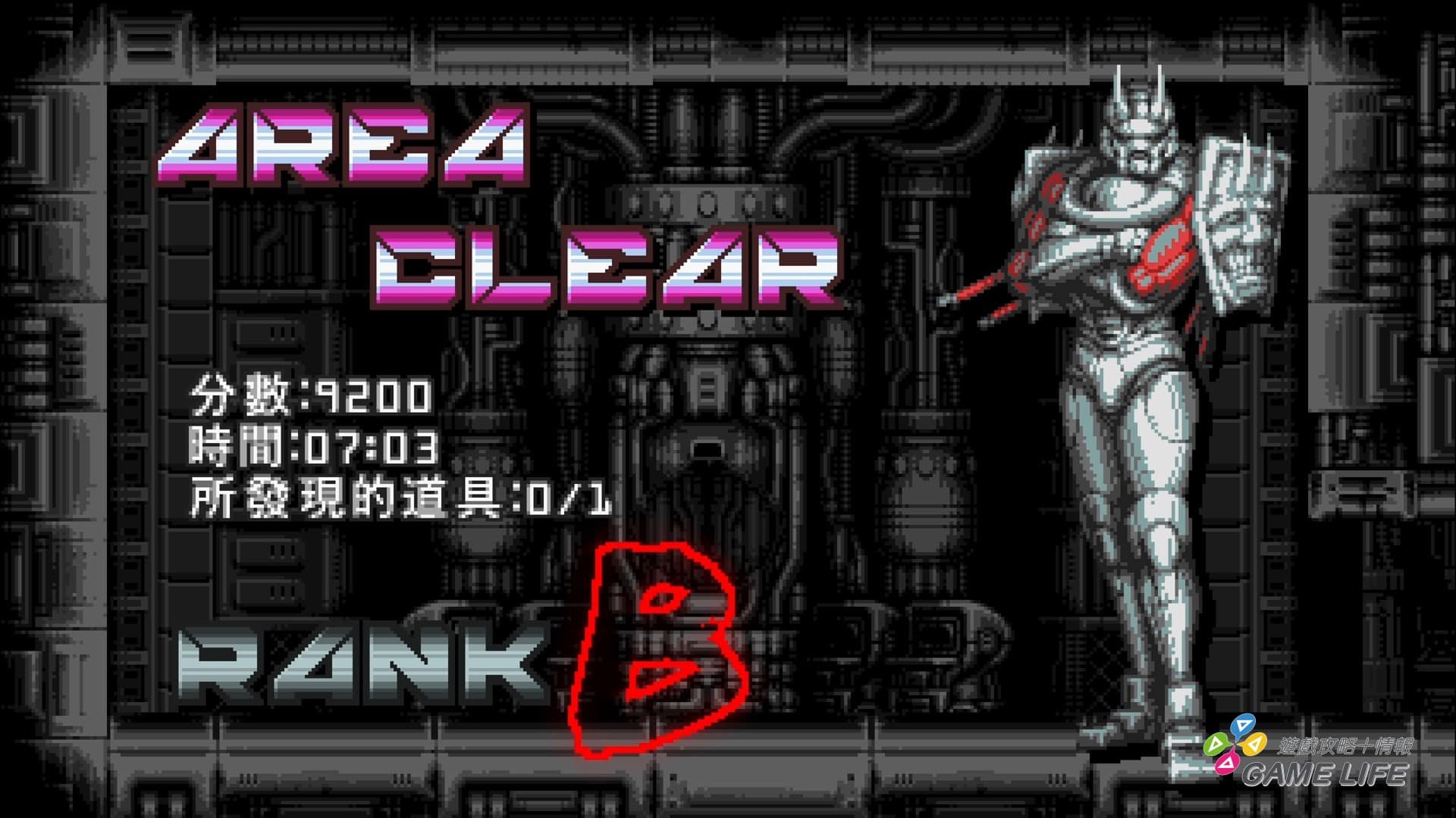 另一個建立起遊戲難度的地方在於探索跟資源的分配,像剛剛提到使用特殊武裝會消耗能量,但能量不易補充,就算特殊武裝效力夠強也不能亂用;其次就是幾乎所有關卡都有隱藏能強化玩家角色的零件,例如兩段跳躍或自動回覆能量等,由於過關後可以檢視該關卡是否有漏拿道具,寶貴的強化功能,還是花點時間去尋找會比較好。