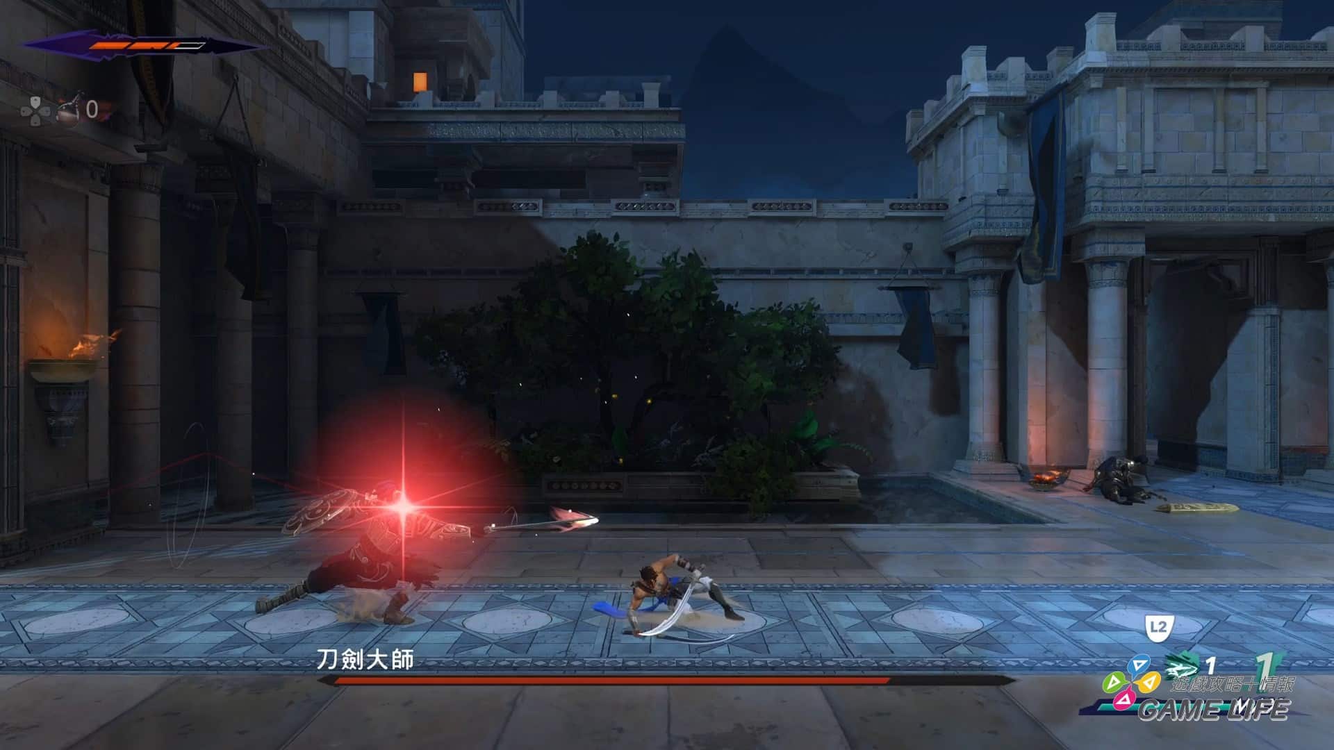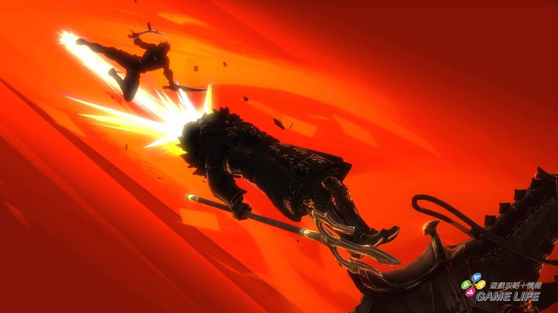 要注意的是敵人除了普通的攻擊,還有發出紅光跟金光的攻擊,紅光攻擊是絕對不能與其過招的強力攻擊,用盡辦法也要躲過;金光攻擊就可說是敵人的最強殺招,被擊中就是莫大傷害,但是如果架刀成功,就會強制進入一段動作演出,薩爾貢以特殊的動作給予敵人大傷害,這也能說是本作戰鬥面上一個非常必須熟練的要素。