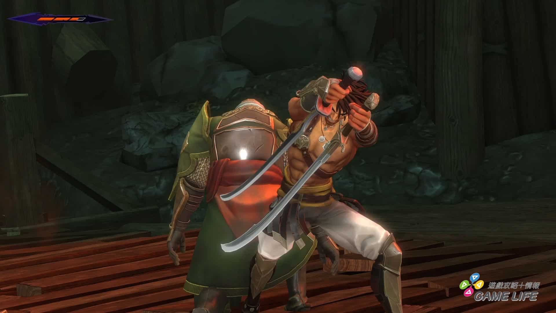 光靠迴避躲開攻擊挑敵人破綻的話,多半是只能偷個一兩刀,不一定能隨時給予有效傷害。這時就要用到防守系統的「架刀」,多數時候玩家能取消攻擊擺出「架刀」這個動作,只要在敵人攻擊快命中自己時使用架刀就能彈開敵人攻擊使對方露出較大的破綻,這時就比較有機會給予較多傷害。