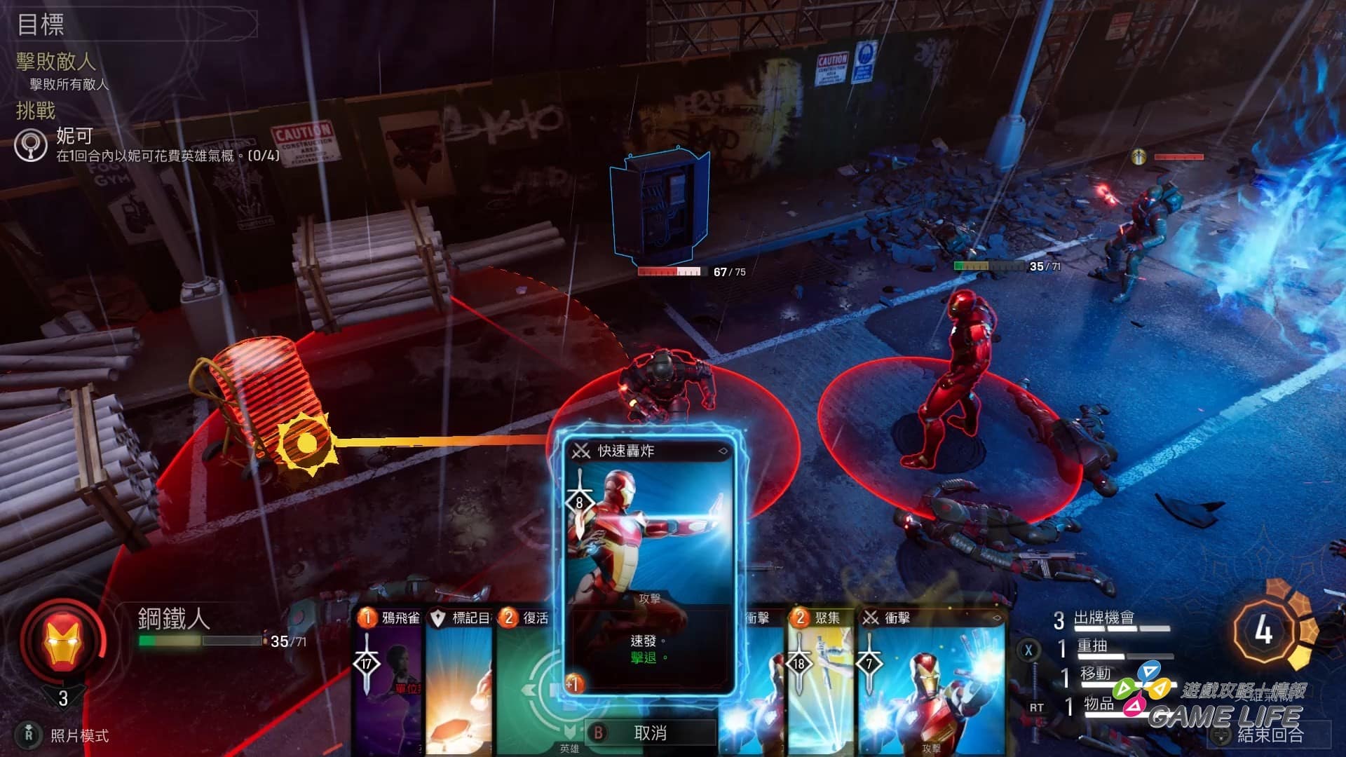 這是角色扮演的部份,前面為何提到這遊戲有戰棋要素,就是因為敵我雙方的所站位置都戰局影響其實很大。卡片有所謂的「速攻」、「嘲諷」等各式各樣的附加能力,其中有個「擊退」能力,能把目標擊飛去撞其他人、路邊的汽油罐、發電機等,進而觸發追加傷害,所以玩家經常要思考每一次發動攻擊,是否能用附加能力達成最大效益。