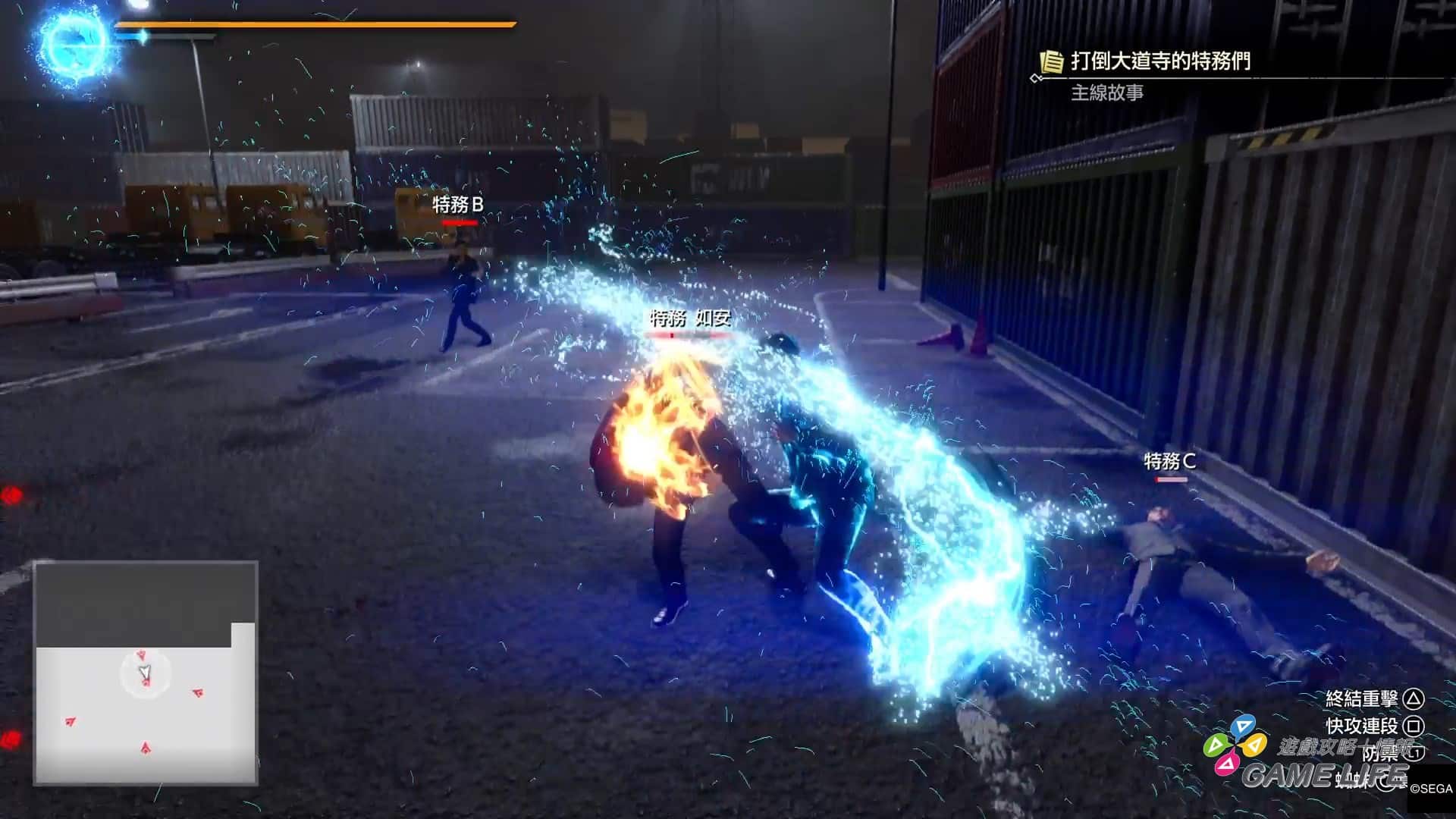 「特務」就是這次遊戲新要素的看頭了,基本攻擊動作就是小傷害但是攻擊迅速,但是有所謂的特務專用的四種方便道具能輔助戰鬥,包含能纏住敵人的絲線、擾亂敵人的無人機、丟出後一定時間就會爆炸的香菸、噴射衝刺的皮鞋,使用科技道具應戰這點就跟以往桐生的戰鬥方式相差甚大且非常新鮮,玩起來也頗有樂趣。