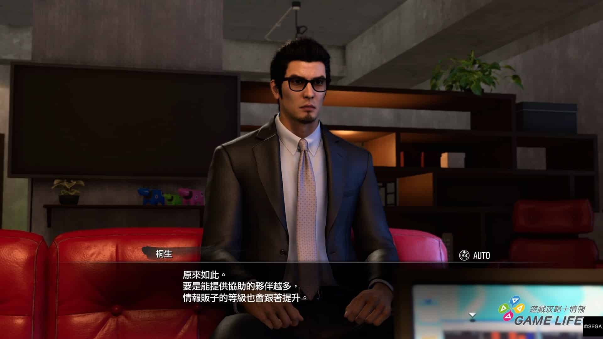 《人中之龍》系列隨著系列作增加,關聯的支線要素也越來越多,像是本作就連《審判》系列都可以友情客串。再加上剛提到說本作支線任務幾乎佔了大半的遊戲時間,特別是在「赤目」這個角色登場後,她所帶來的一連串赤目任務,多到會讓玩家搞不懂自己到底是特務、還是打雜跑腿的。