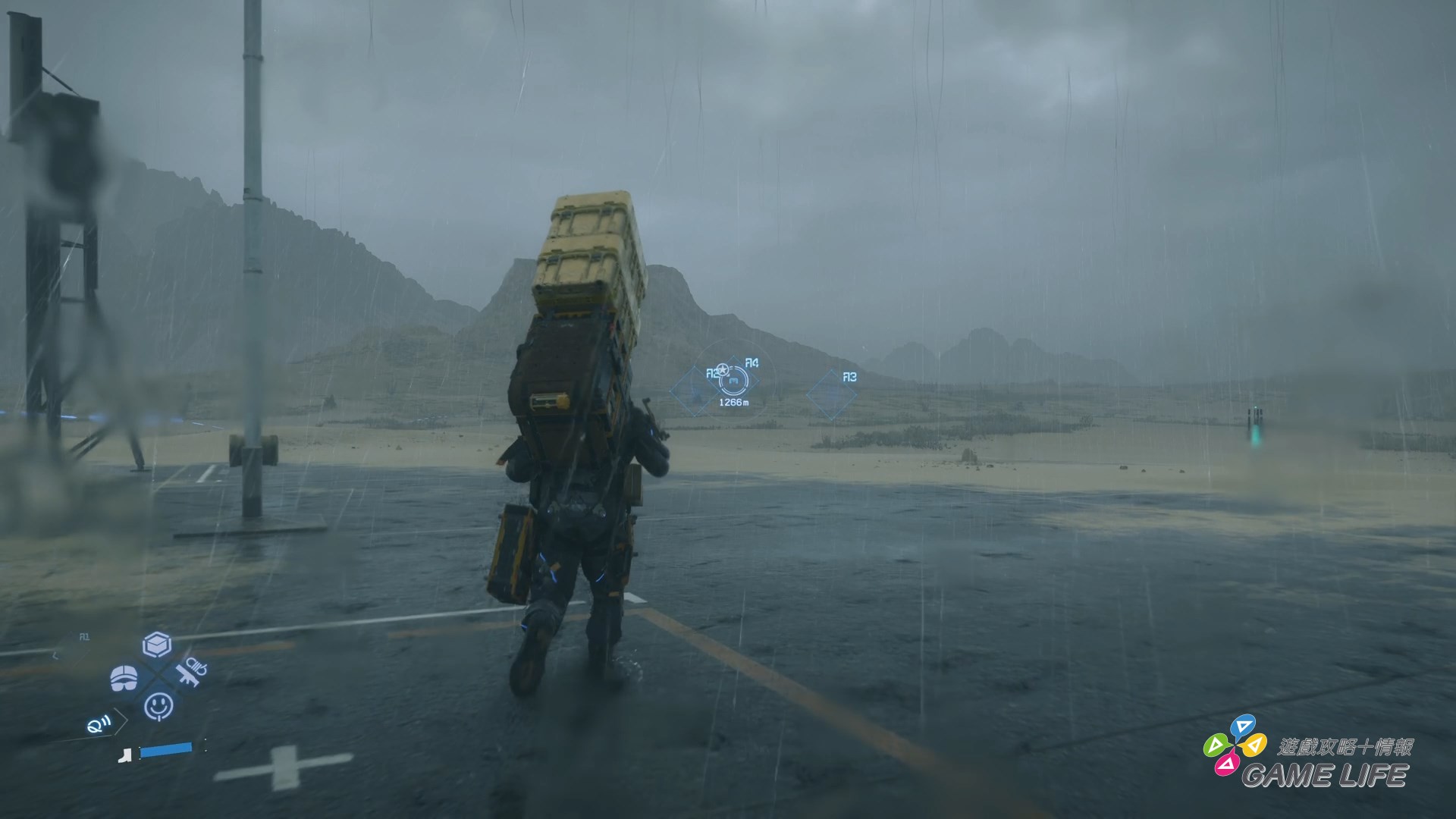 當然隨著遊戲進展,山姆的裝備也會越來越先進,例如初期就有前作玩家熟悉的輔助機器可以幫玩家測量路線,知道哪條路比較平坦,隨後還會有機器手臂幫忙撿掉在地上的貨物、也將會有交通工具加速移動,讓玩家送貨起來會更加方便,但可不表示要前往的區域就會變得更加輕鬆。