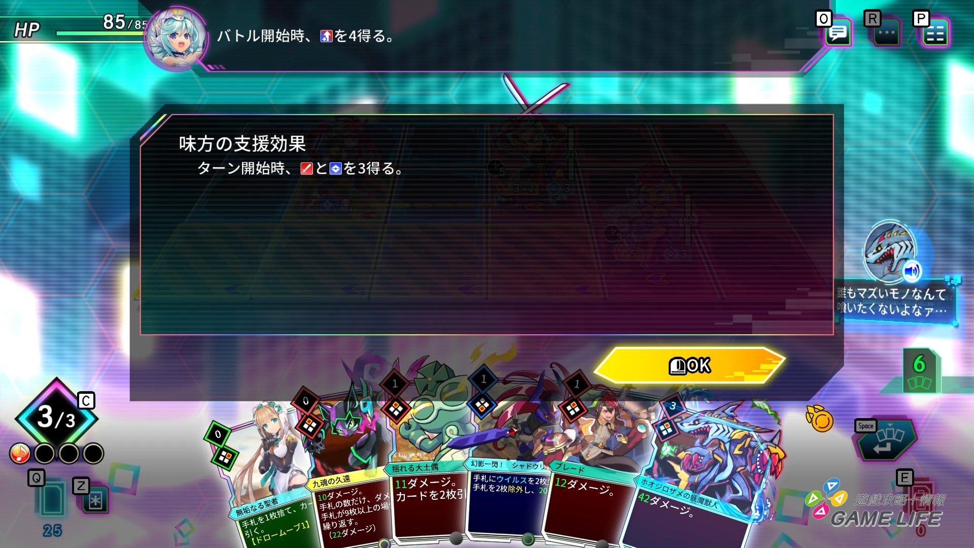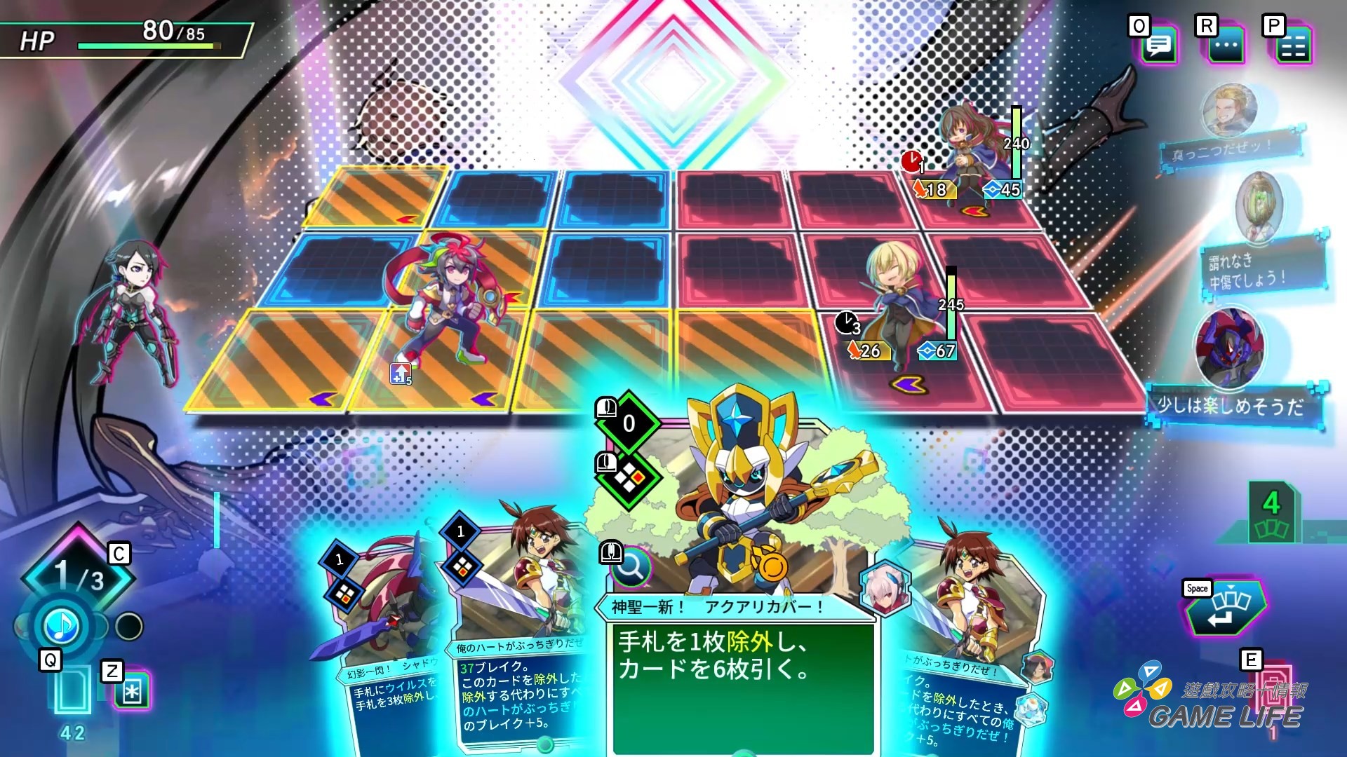 而玩家除了牌組外的基本資源就是 3 點 Cost,消耗來使用卡片、進入迷宮前事先設定好,能在需要時立即抽上手的關鍵牌、能消耗來強化卡片的能量球。另外一個最重要的存在也是本作重點,就是「歌姬」。一關由三層迷宮構成,進入迷宮時隨機獲得一個符合這遊戲世界的歌姬,三層迷宮也會各自配置一名符合這關卡牌組戰術的歌姬,只要讓歌姬加入我方就能在滿足特定條件讓歌姬唱歌,並獲得相當有利於戰況的輔助效果與能量球。