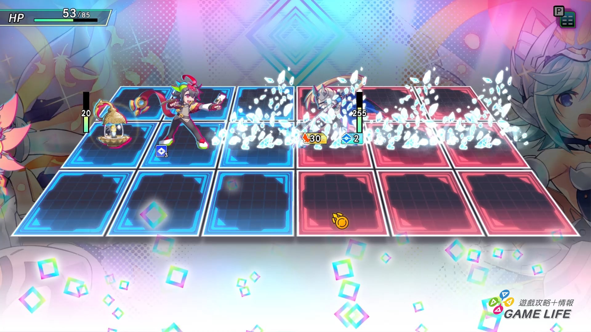初次看到遊戲戰鬥介面的玩家,可能會想起《洛克人 EXE》系列,不過那只是介面相似,遊戲系統還是有不少差異。敵我雙方各自站在屬於自己的九宮格領域,玩家方利用手中的卡牌進行攻擊、破防、抽牌、強化、移動等等動作,敵人則遵循自己的行動順序,在玩家使用一定量卡牌後進行阻擾跟攻擊。玩家的目的基本上就是觀察敵人的攻擊指示,想辦法迴避、打斷,或移動至安全範圍,最終目標就是戰鬥中全滅敵人。
