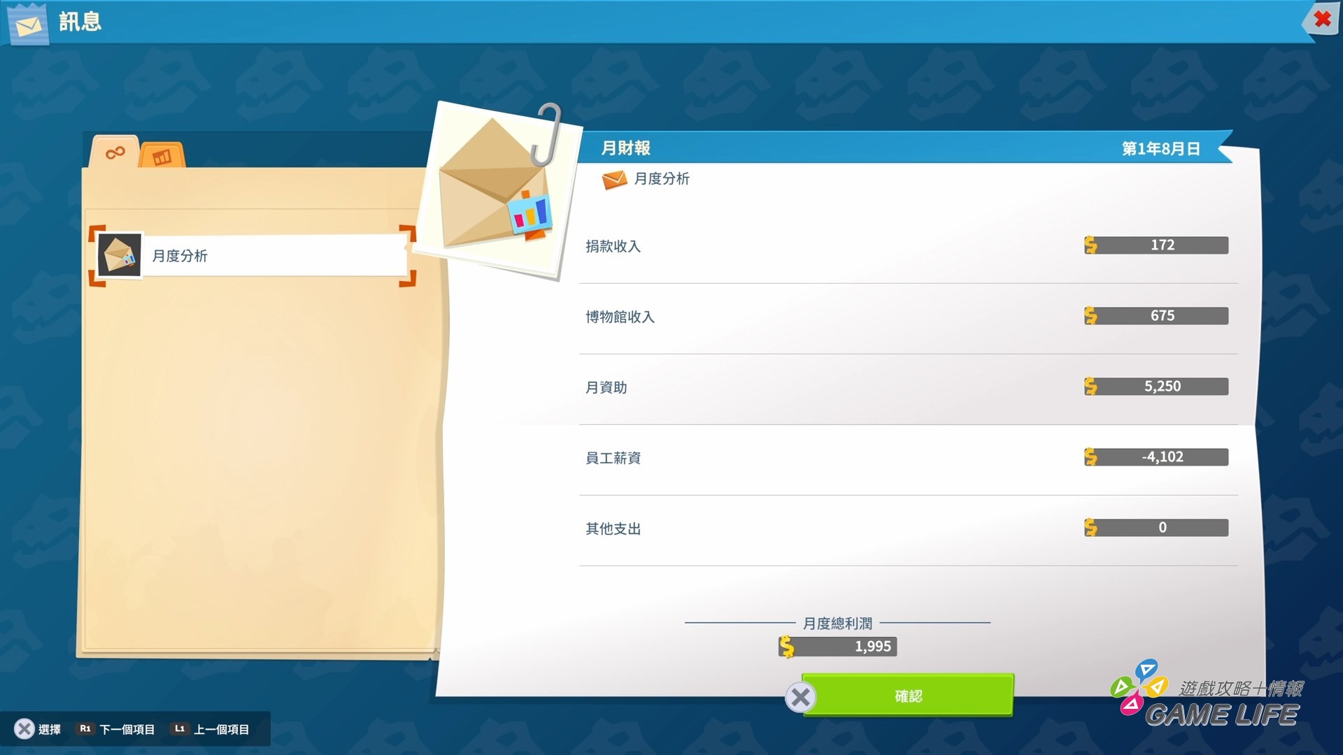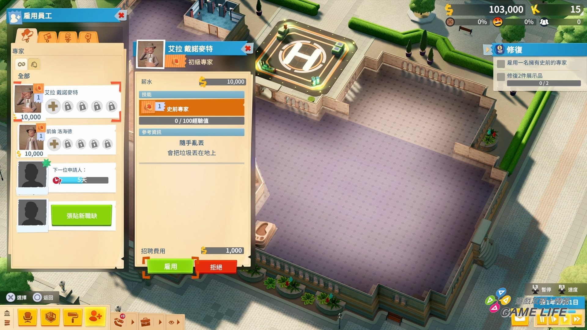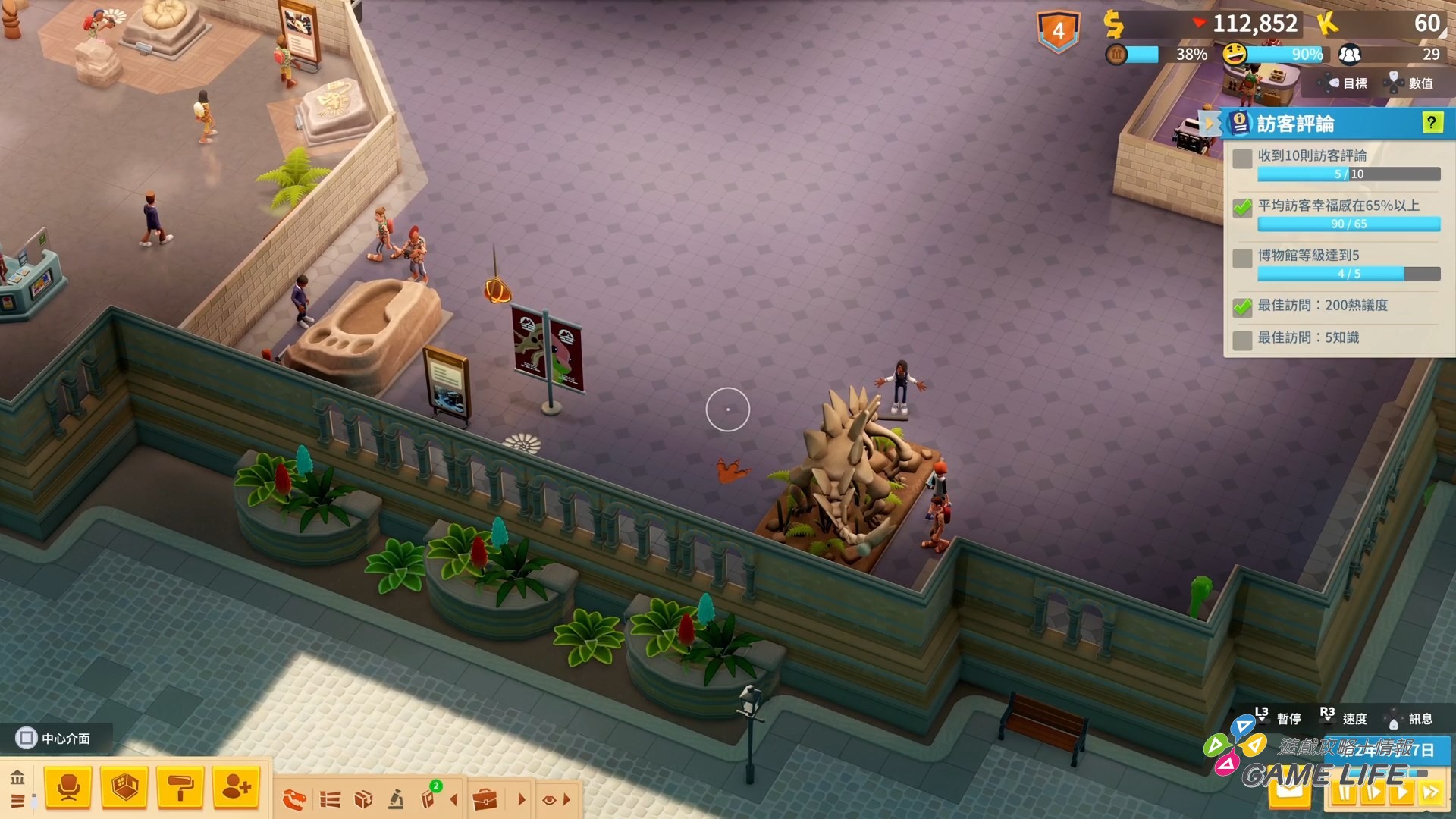 在介紹探險要素時也說到,這遊戲有所謂的「開放」,跟一些初期就把所有要素都開放給玩家的經營模擬類遊戲不同,本作的進展概念就是「按部就班」,達成一個目標後才會開出新要素給玩家嘗試,所以對於講求自由度的玩家來說,多少會玩得有點綁手綁腳,覺得都是在花時間研究怎麼達成系統要求的目標,而不是在想怎麼設計出自己風格的博物館。當然是否會產生這樣的想法,也是見人見智,不過遊戲一開始的確是推薦先以完成畫面上提示的目標,等能做的事開放夠多了再來隨心所欲的嘗試。