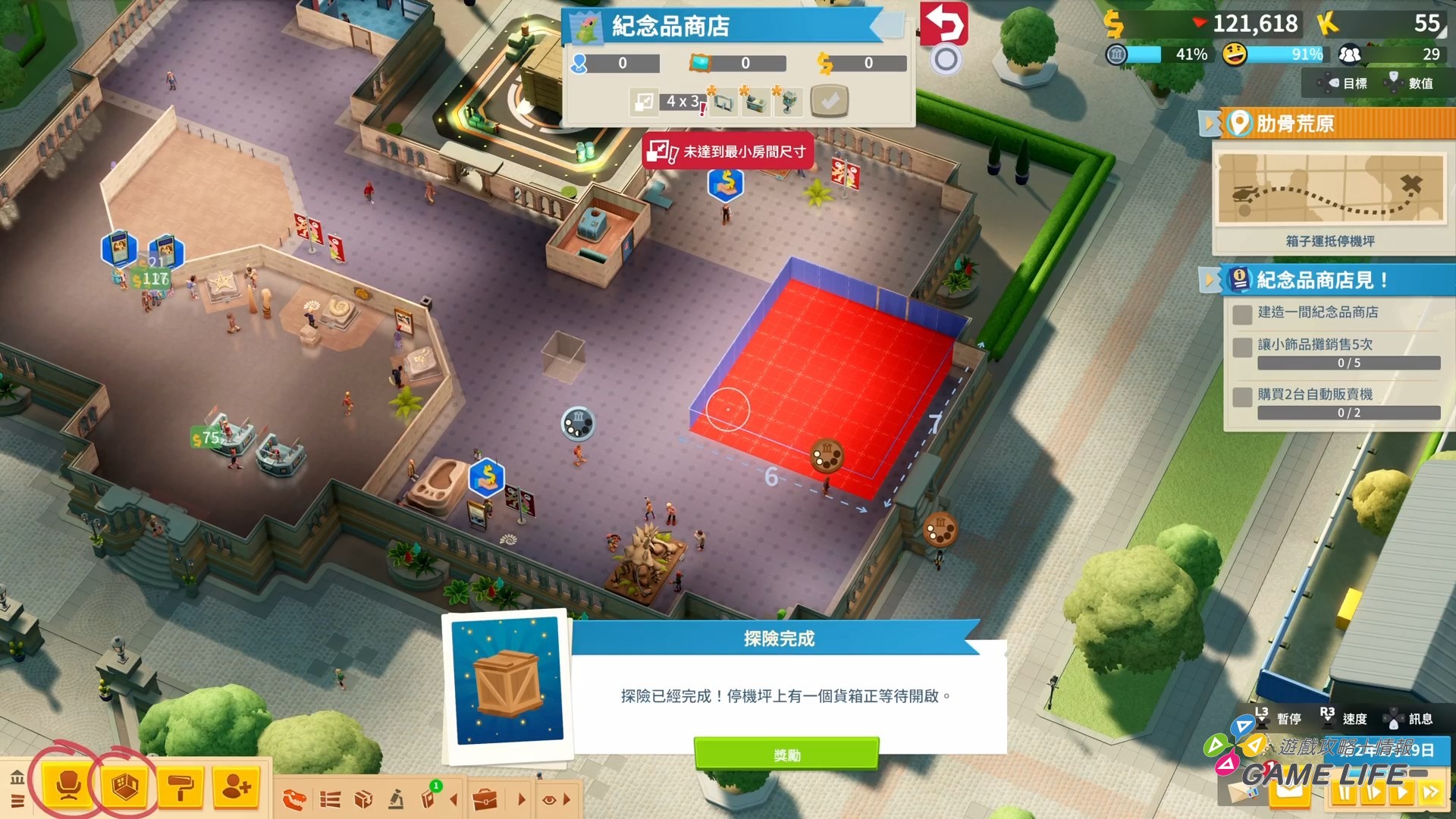 經營模擬類遊戲通常入門最大的麻煩就是,要從 0 開始擺設產品、雇用人員,甚至還要規劃室內空間的分配,容易弄到一開始不知道該從何著手起,不過《雙點》系列最大的優點就是有明確的指引跟教學,讓玩家可以按部就班來進入狀況。玩家可以選擇有系統指導的劇情模式,也能選擇完全自己摸索的沙盒模式,自己思考要如何設計一間博物館。