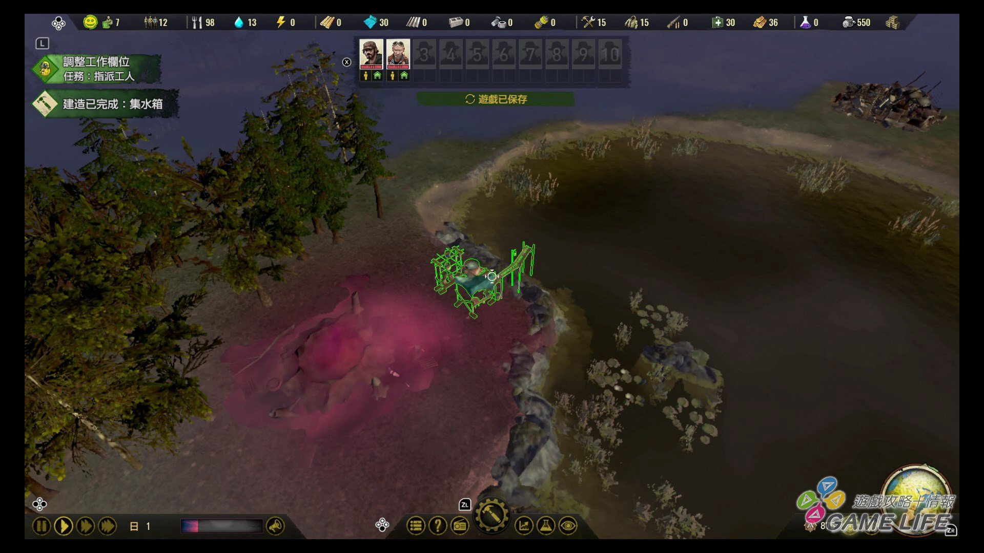 再來就是留意四周的廢棄物,會找到塑膠跟水等資源,再去設定搬運材料到哪些地方,確保資源後就是設置收集食物的打獵小屋以及確保水源的水井等等。以一款經營遊戲的初期來講,其實發展蠻快的,一下子就讓玩家進入要掌控很多資訊的狀況。但可能在進入遊戲狀況外,可能還有別的事情要先習慣。