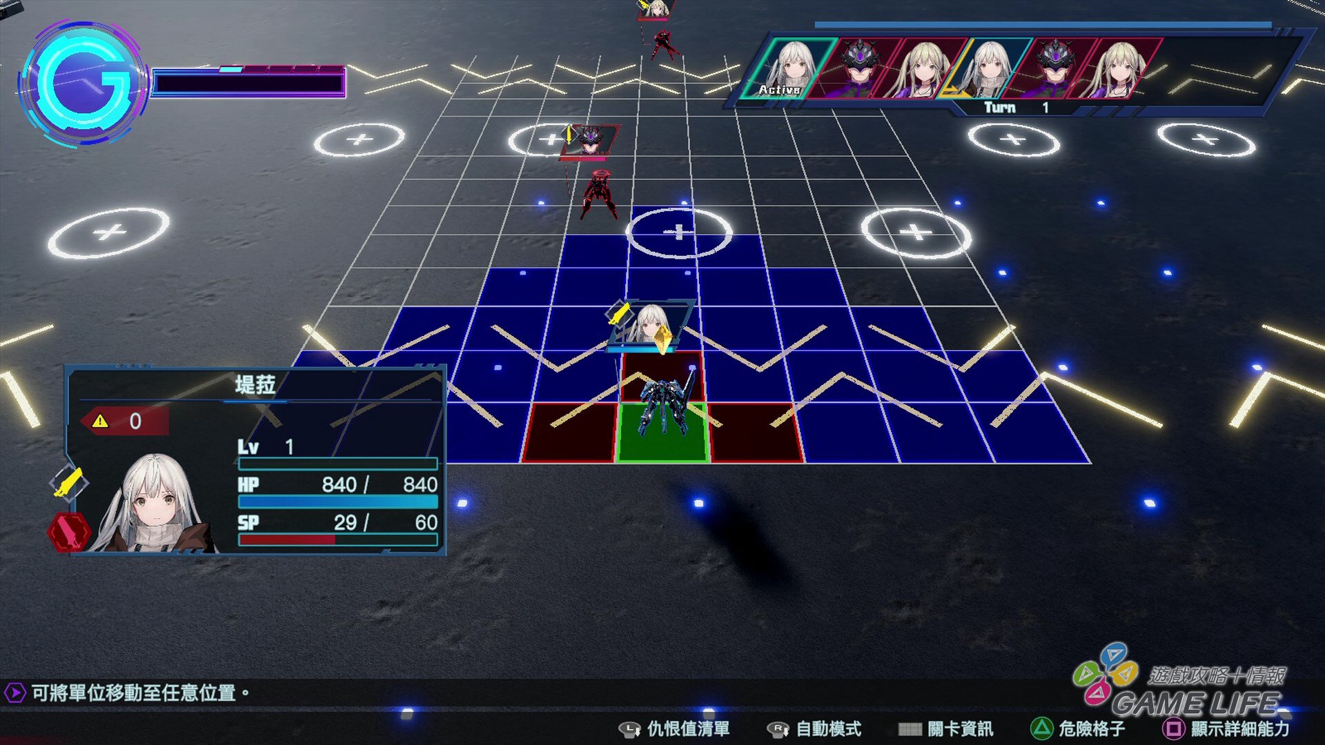 遊戲有個很重要的概念就是仇恨值的設定,本作敵我雙方 AI 的設定都不算聰明(因此不建議玩家用自動模式操作我方戰鬥),思考邏輯就是移動範圍內有射程內的敵人就打、挑血少皮薄的目標打,因此移動位置如果不好好考量,我方機體可是三兩下就會被擊墜,這時就必須要去控制「仇恨值」這個可見的數值,讓血多皮厚的角色去「強迫性」地逼敵方攻擊她,確保其他人員的安全。