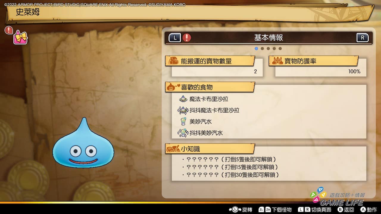 收集要素部份,除了上述的寶物外,也有圖鑑要素,一般角色扮演遊戲的圖鑑開放,多半是該魔物打倒後就會開放。本作則是採用計算數量的,打倒過一次只算登記入圖鑑中,關於那魔物的各種小情報,還必須要打倒牠 15 次、30 次才會開放。如果這是一般角色扮演的話或許能辦到,但這款基本就是單線進展而且並非隨機遇敵,也就是不會特別去遭遇同樣敵人很多次,是否有必要為了不重要的小情報去反覆找同一隻魔物來殺,也是個問題。