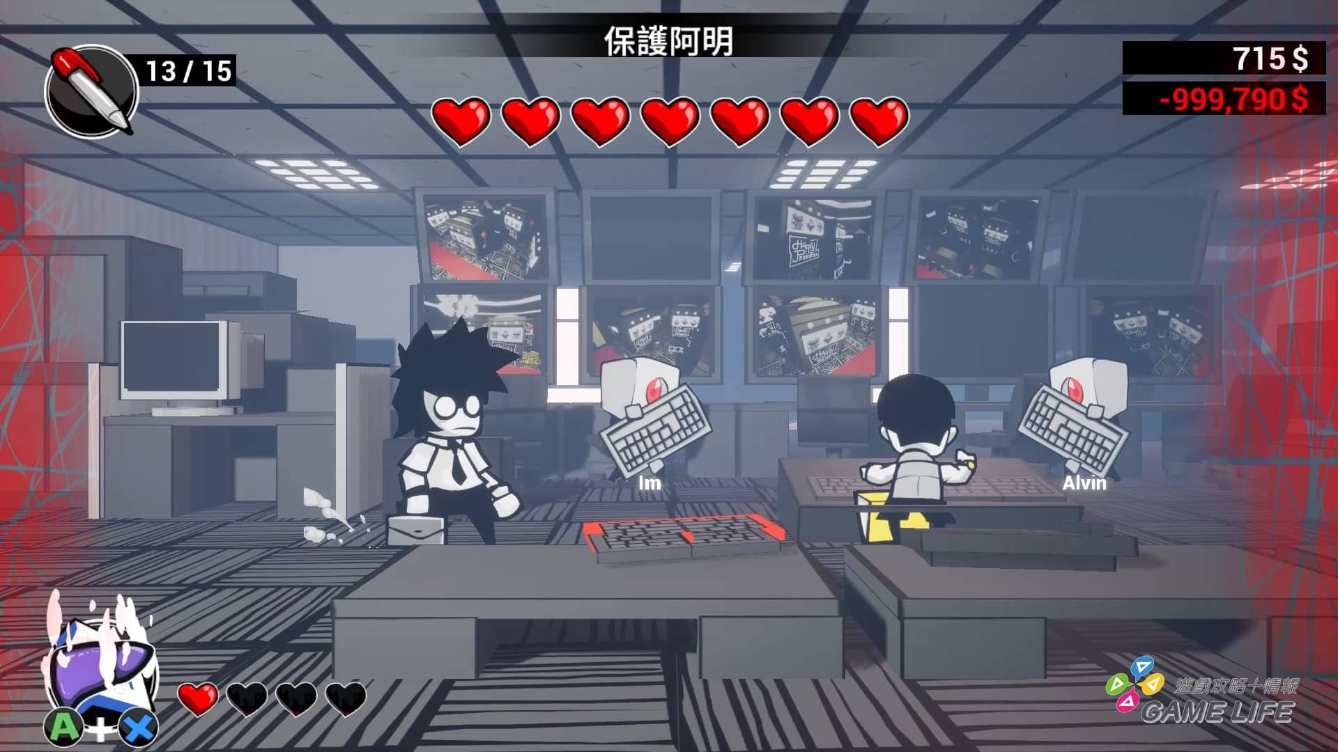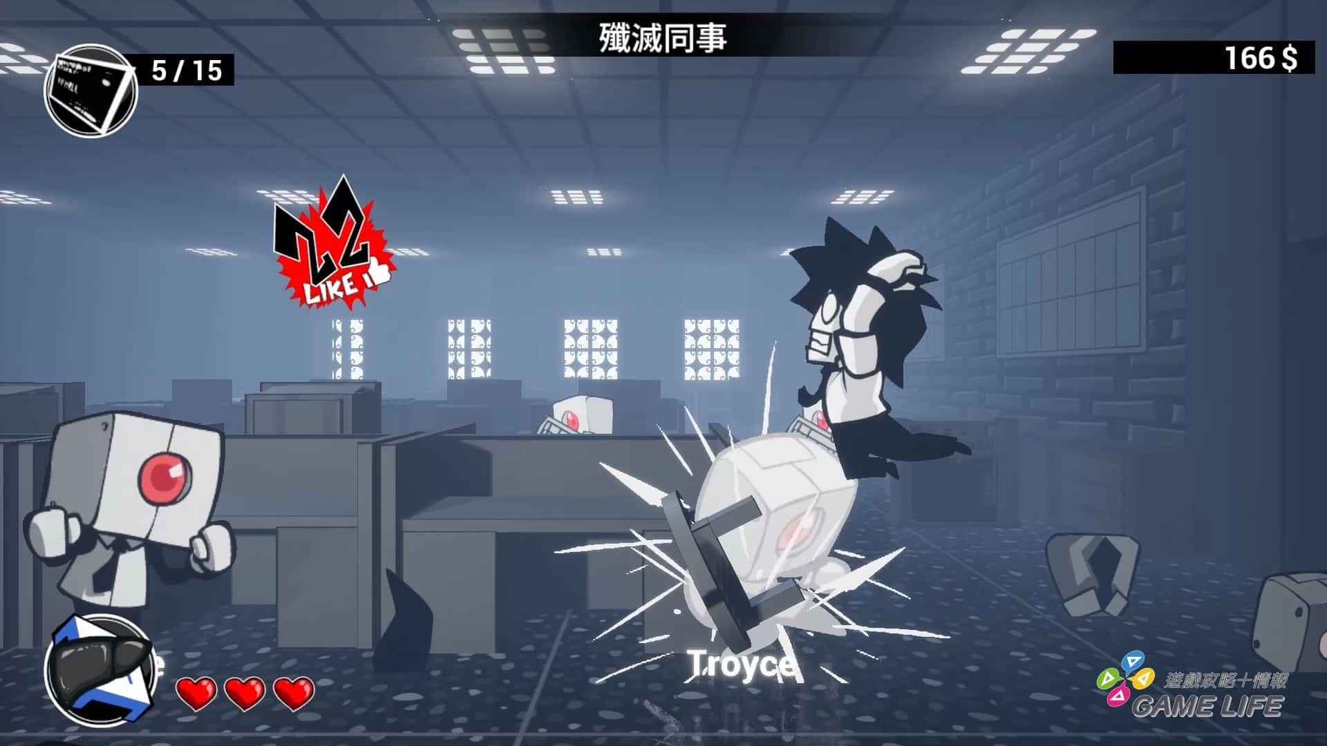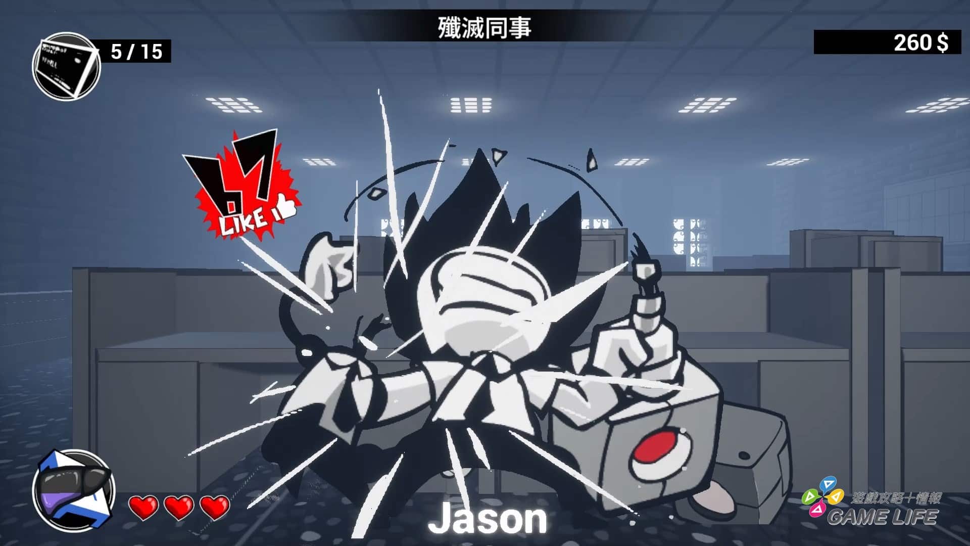 同時敵人基本上都是一群不會勞累的機器人,手撕機器人也不用擔心什麼倫理道德,搭配故事劇情簡短地以黑色幽默方式敘述著各種上班族在黑心公司上班的痛苦經驗,所以整體氣氛都是讓人想吐嘈的搞笑風格,不需要太擔心畫面表現過於血腥暴力,某種程度上,算是老少咸宜的。