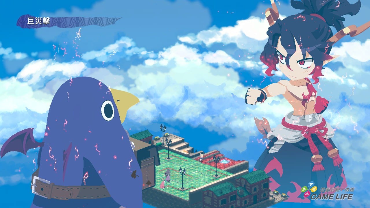 另外一個新要素就是「巨大化」,遊戲中會有一個「激弩」計量表,全滿時就可以指定一個角色在地圖上巨大化,攻擊地圖上任何位置,可說是一口氣轉變戰況的要素。要注意的是,敵人也會使用,玩家一不小心就可能戰線崩壞。同時發動「巨大化」還會觸發傷害增加 5 成、女性角色能力上升等地圖效果,由於是敵我不分全體共享,所以這個要素也構成了一種讓玩家必須謹慎思考戰術的戰略性。
