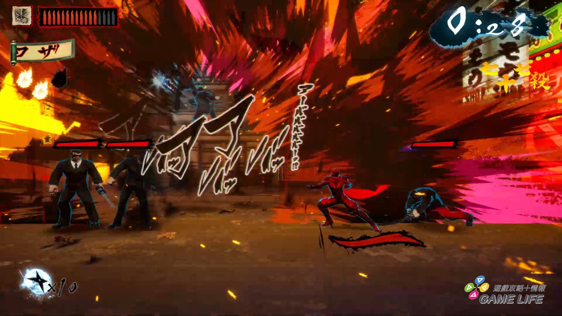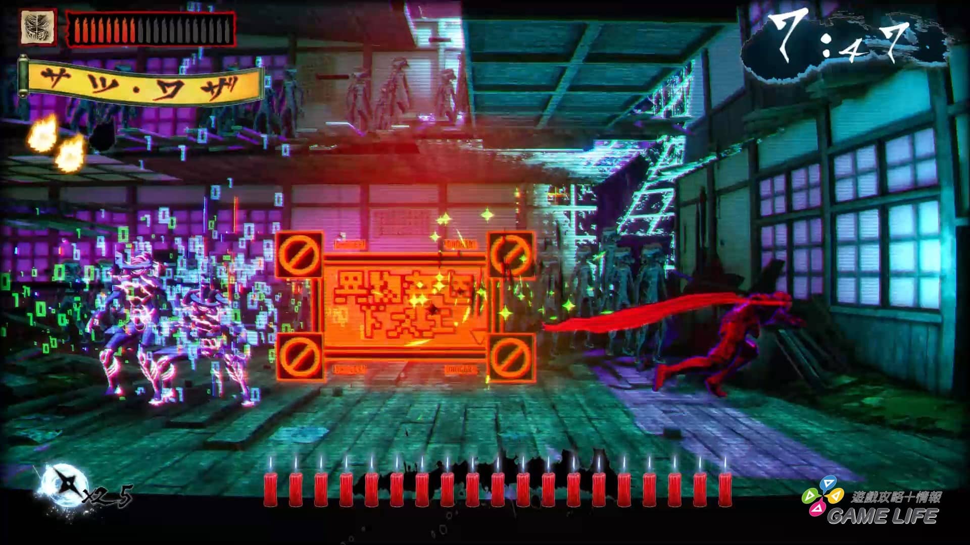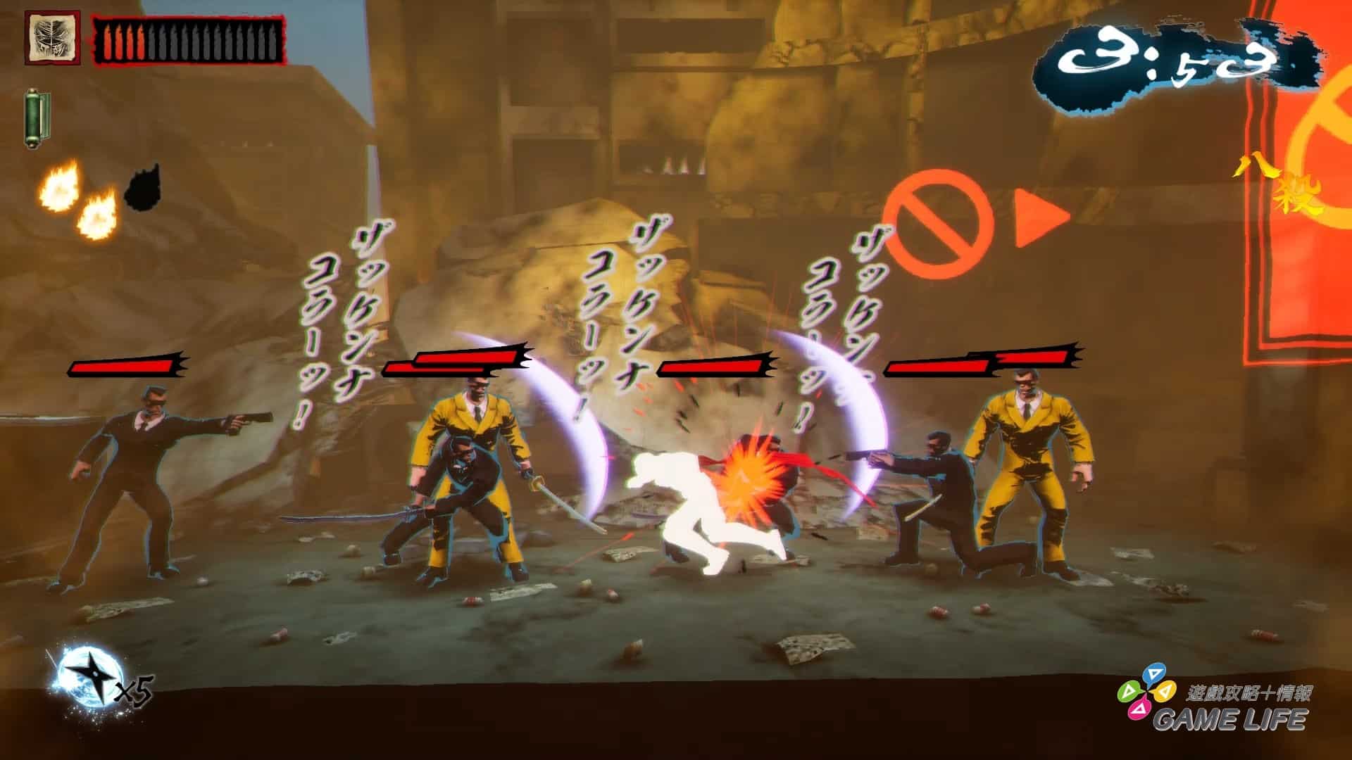 如同最一開始講的,這遊戲並沒有那種華麗特效、強烈演出,本質就是以《忍者殺手》為題材的 2D 橫向捲軸,整體用色也都偏向暗色系以符合《忍者殺手》的世界觀。並利用各種日文跟漢字特效來將玩家拉入《忍者殺手》的風格,所以才會說這遊戲客群其實非常偏向對《忍者殺手》有相當喜好的玩家。