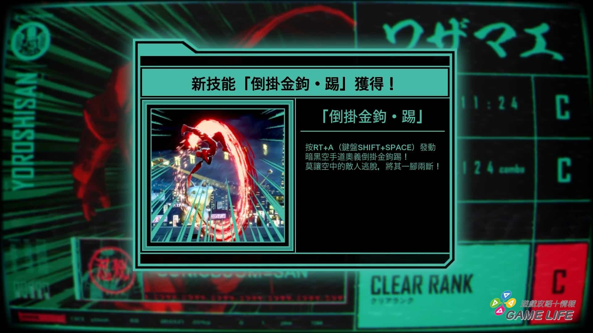 「後橋背迴避」是關卡進行到一定程度開放的新動作,忍者殺手擺出後橋背姿態迴避攻擊,但因為要消耗衝刺用的計量表所以無法連發,如果是在攻擊快命中瞬間進行迴避的話,會看到一個綠色光芒的回復特效,這是回復必殺技計量表,避免頭目戰之類的場合因為欠缺小兵可以打倒難以累積必殺技計量表。