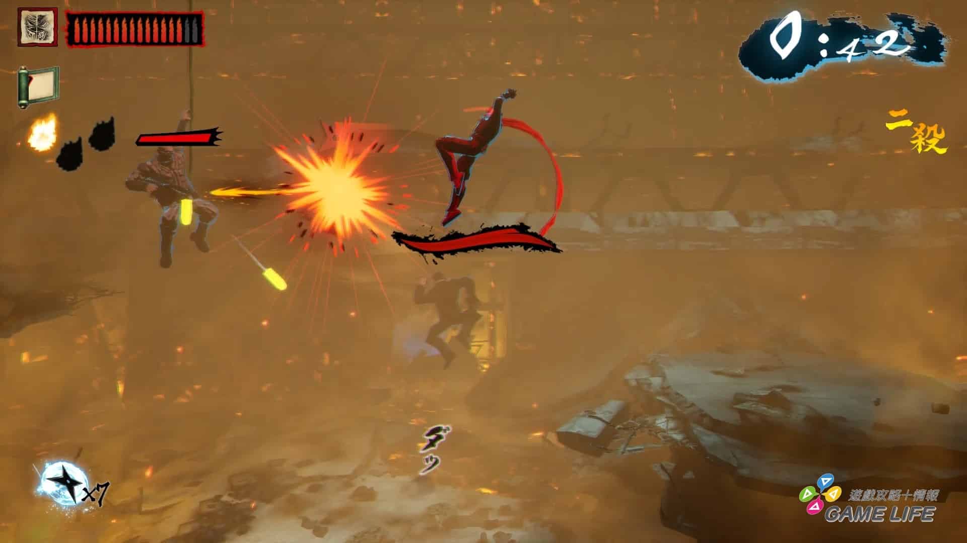 敵人的攻擊其實都蠻快,且不少是使用槍械的遠距離攻擊,而忍者殺手移動上並沒有無敵,就算是使用有攻擊力的衝刺,也只是兩方一起吃傷害而已,再加上有即死的「落穴」設計。所以初期遊玩多少都是要經歷個幾次 Game Over,把關卡路線跟敵人配置留下印象,才能順利過關或者挑戰高評價。