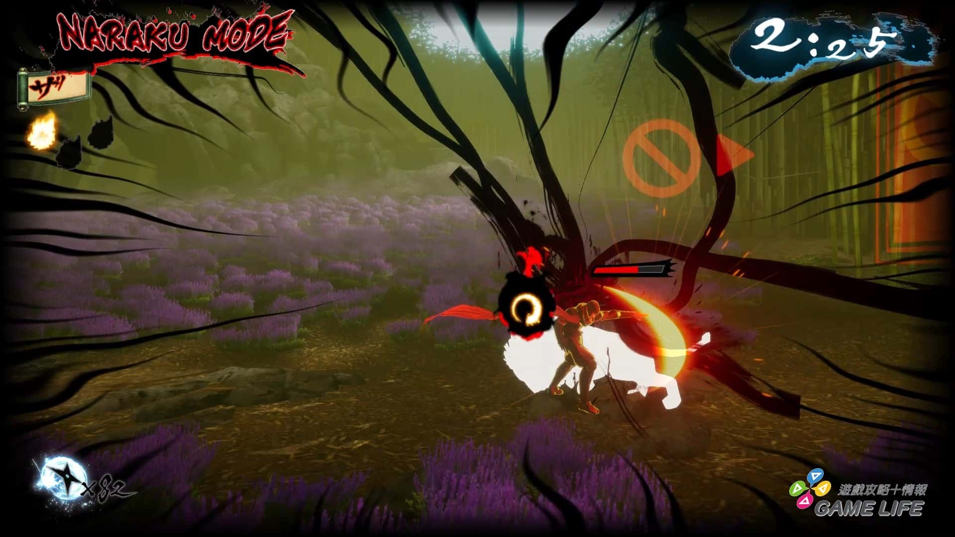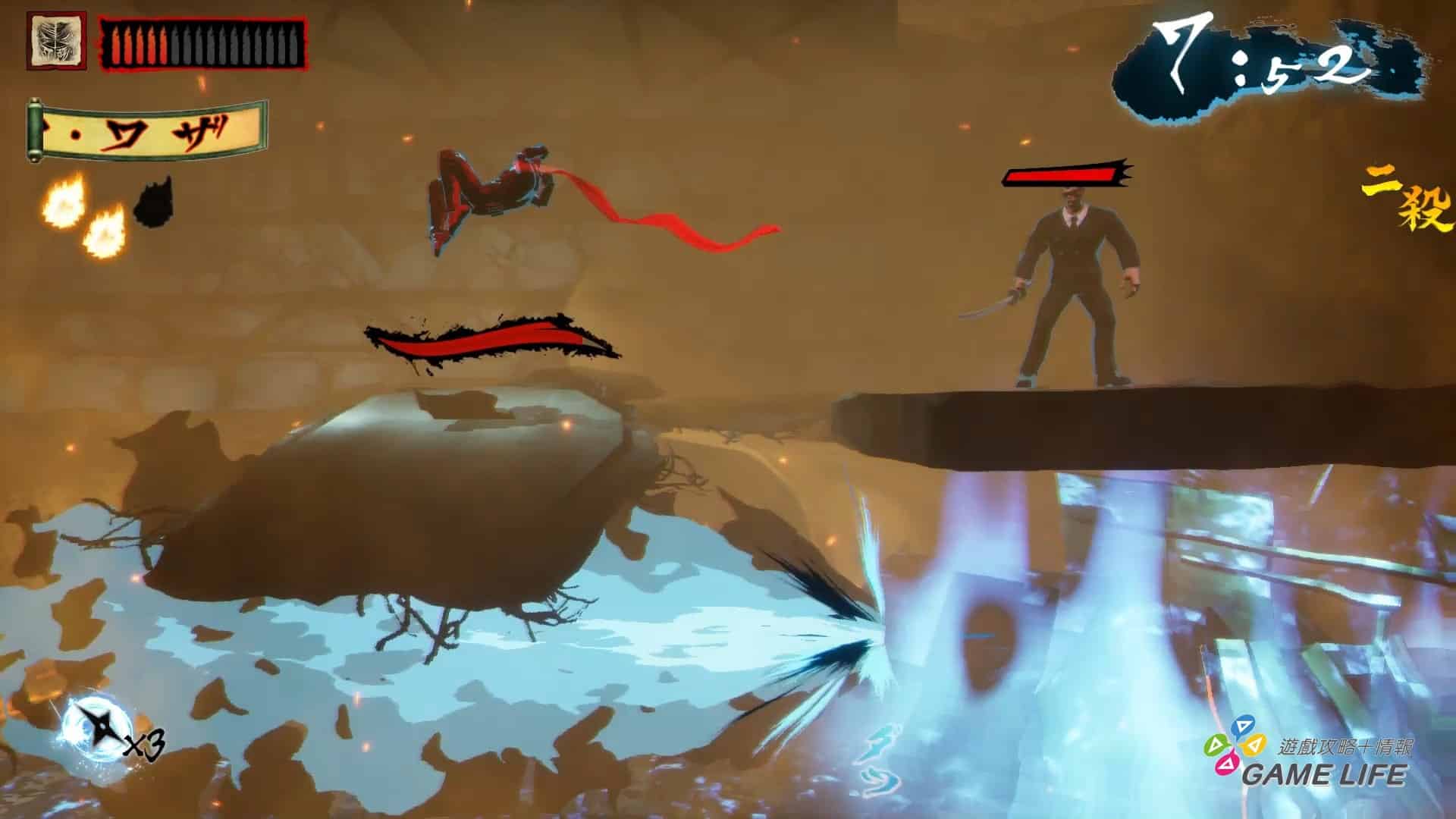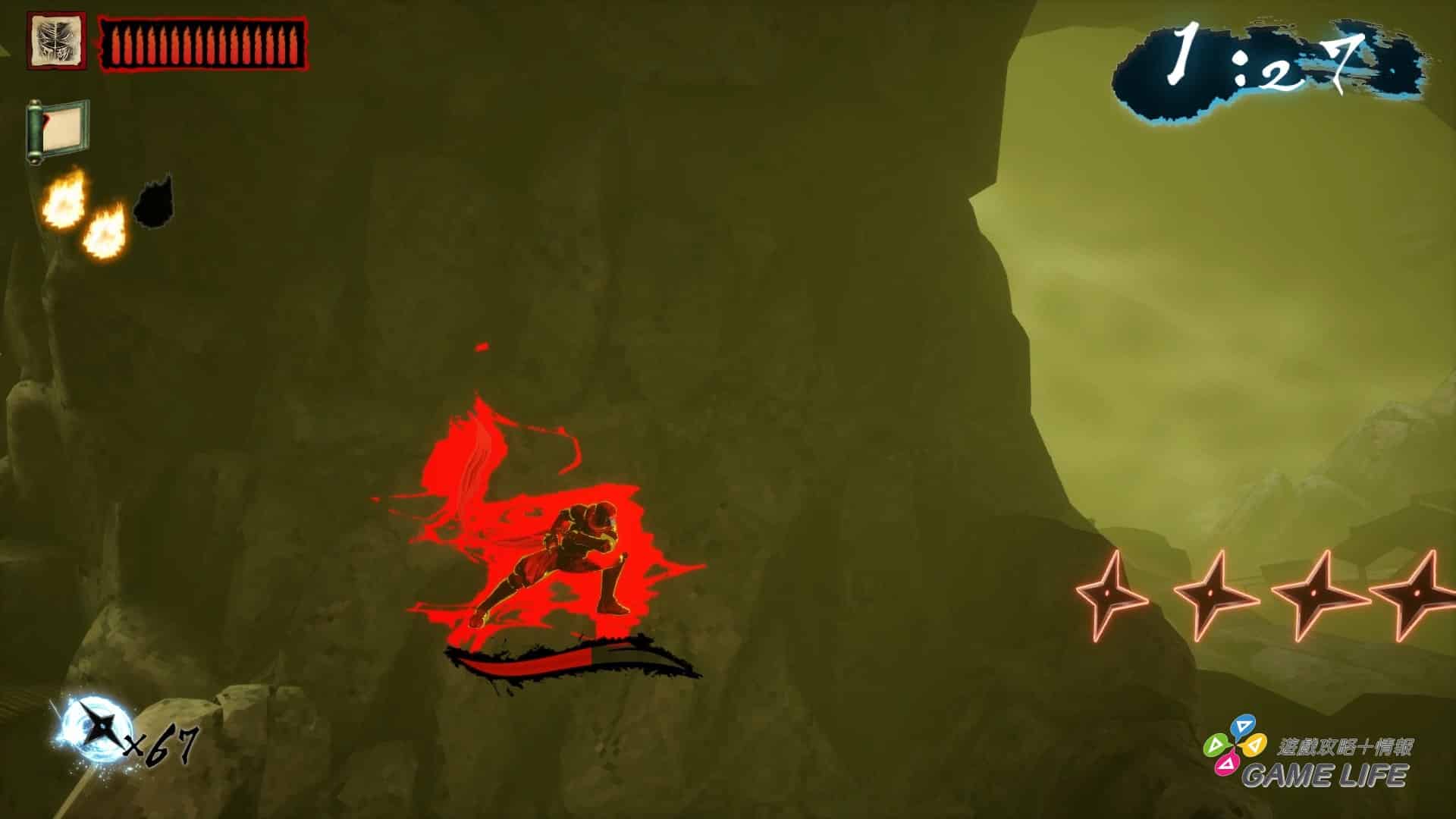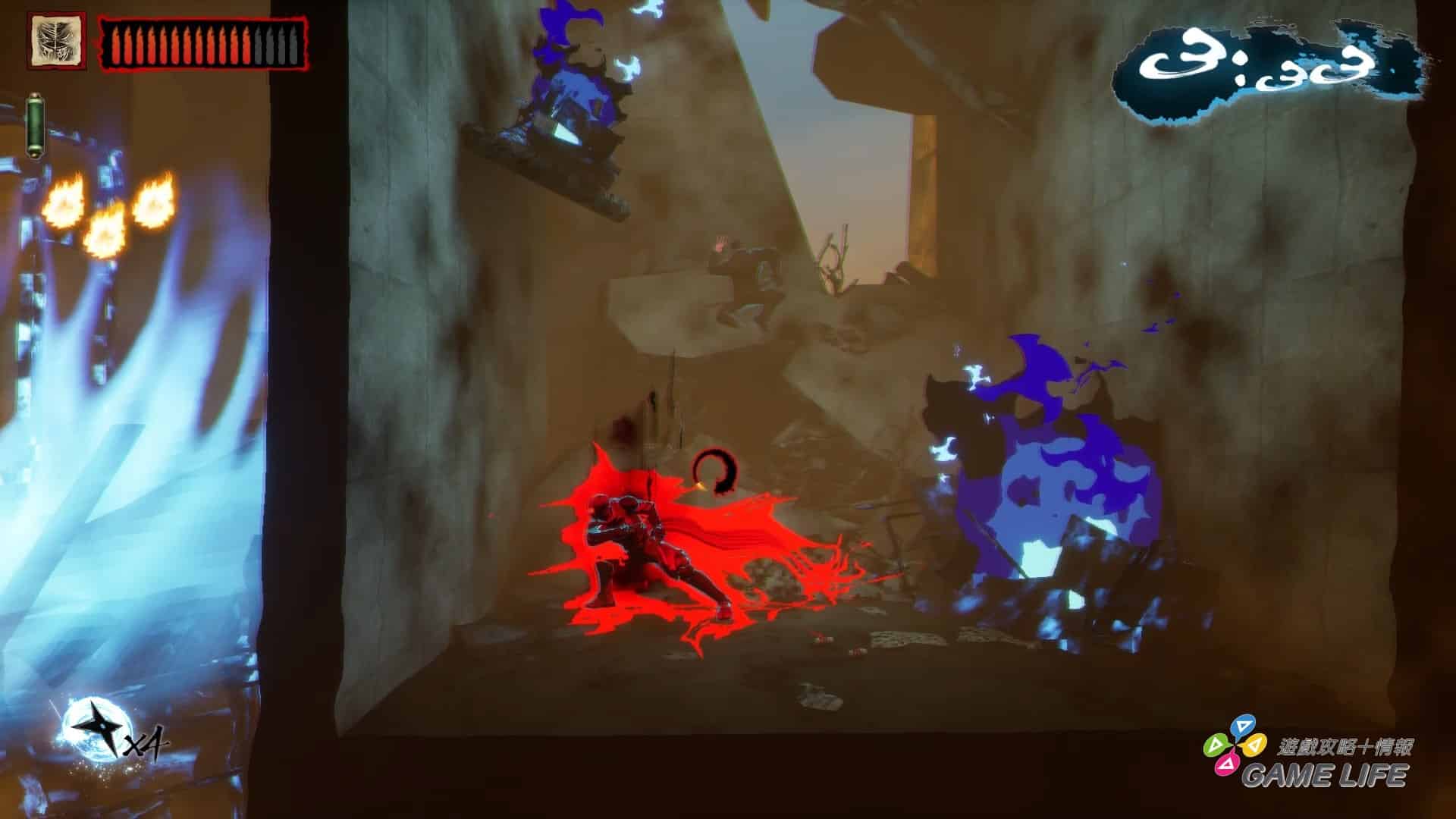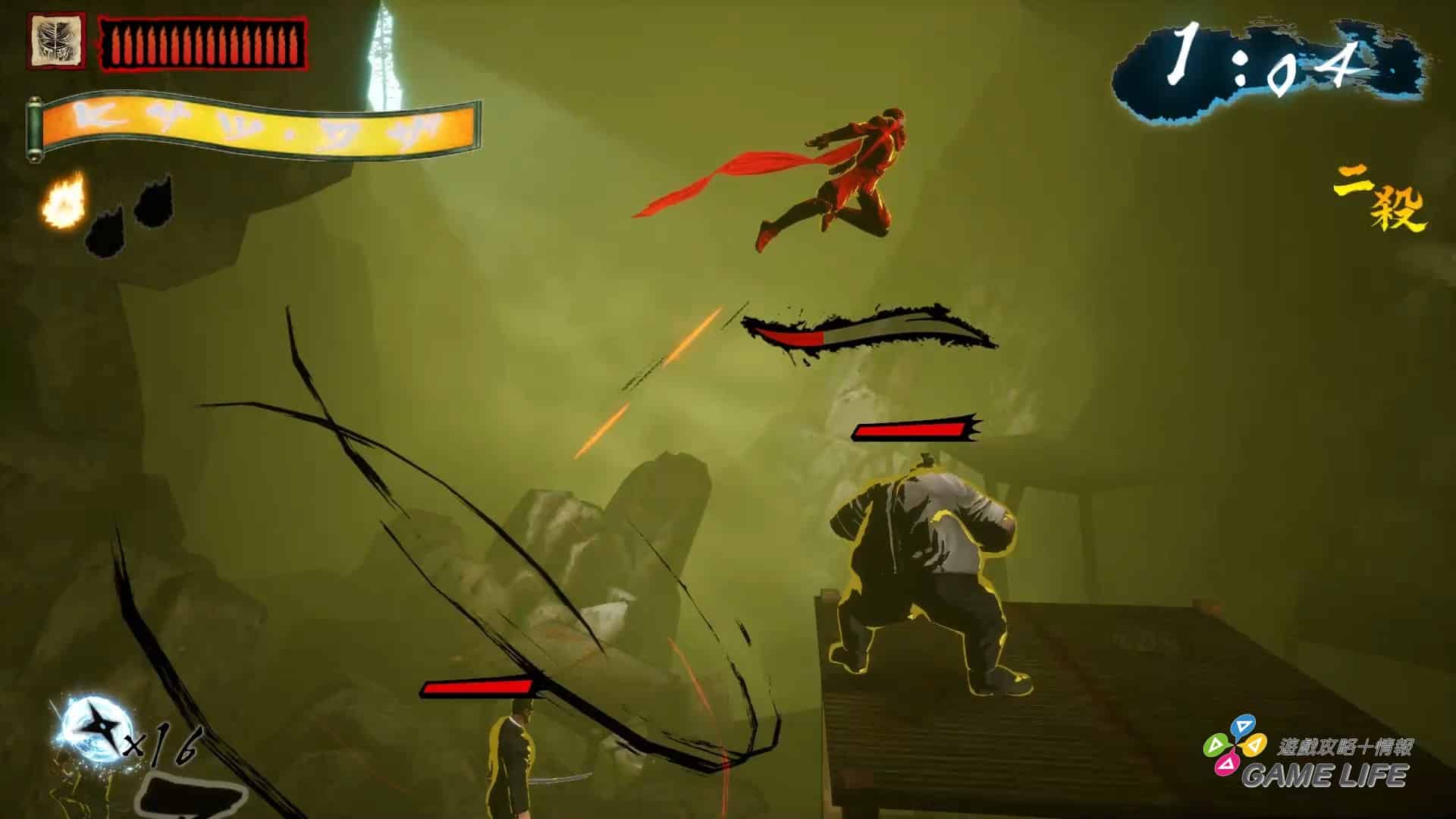 整體手感上,遊戲算是相當輕快,要反映出忍者戰鬥的那種高速快感,像是忍者殺手普通攻擊動作都能馬上反應取消成衝刺跟跳躍,雖然要留意衝刺有一瞬間的準備動作,並不會立即衝出,但操作手感是優秀的,只是因為要強調速度跟衝刺的快感,通常攻擊的判定相當弱且沒什麼打擊感。
