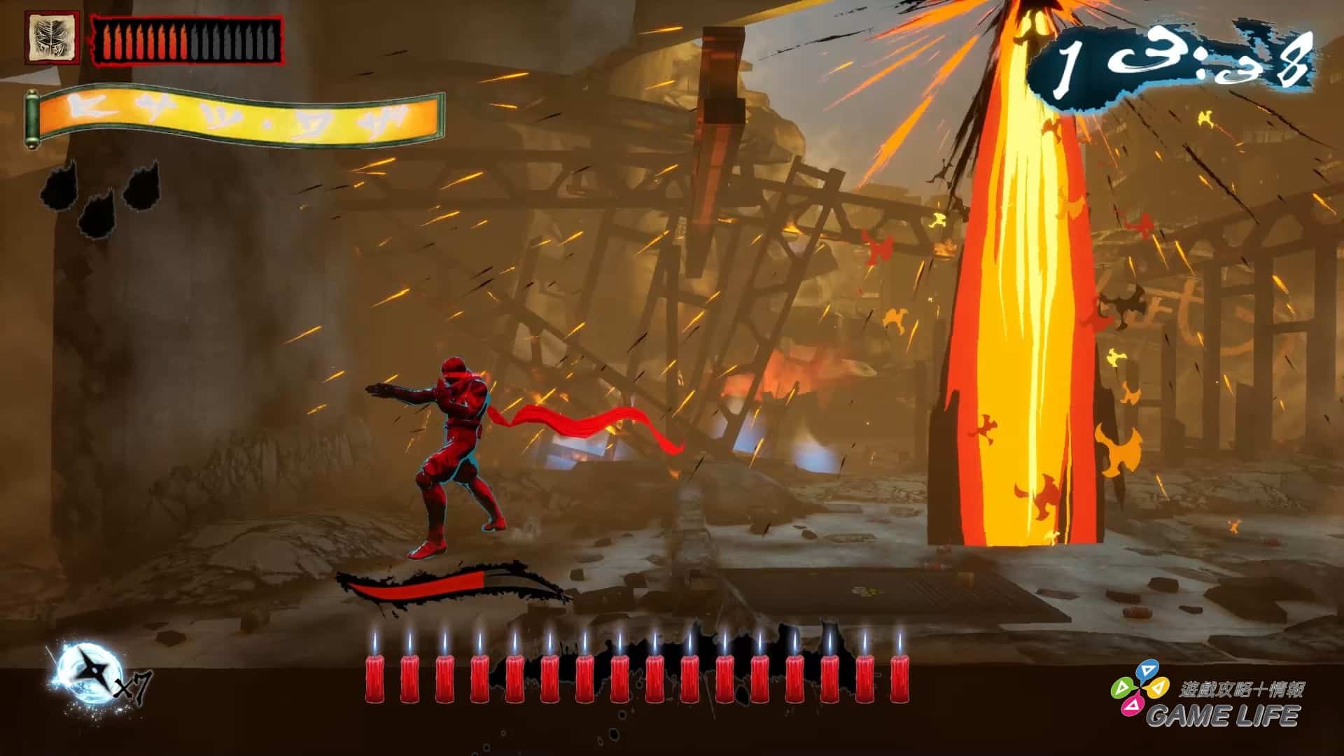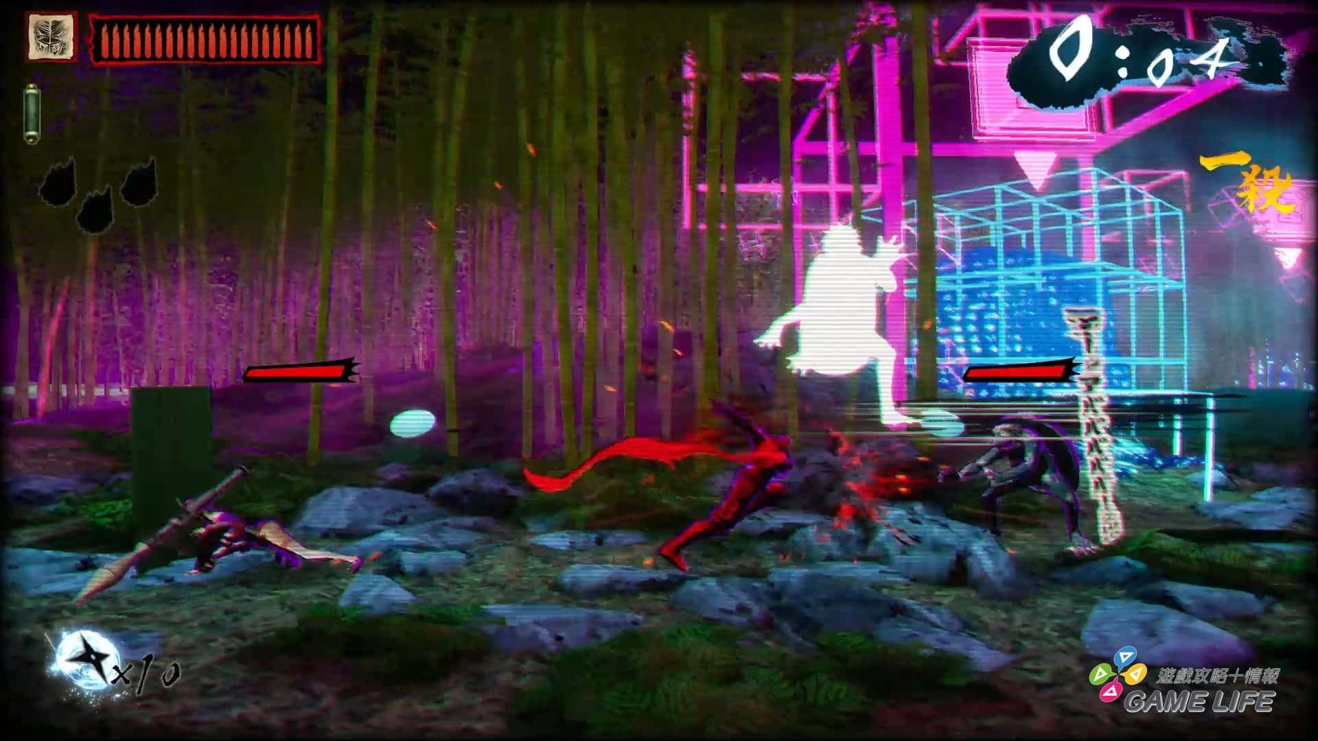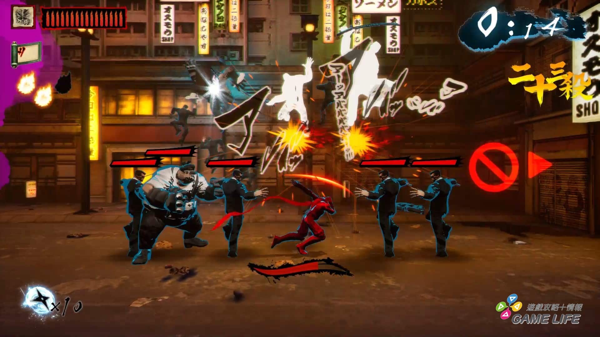 如同最一開始講的,這遊戲並沒有那種華麗特效、強烈演出,本質就是以《忍者殺手》為題材的 2D 橫向捲軸,整體用色也都偏向暗色系以符合《忍者殺手》的世界觀。並利用各種日文跟漢字特效來將玩家拉入《忍者殺手》的風格,所以才會說這遊戲客群其實非常偏向對《忍者殺手》有相當喜好的玩家。