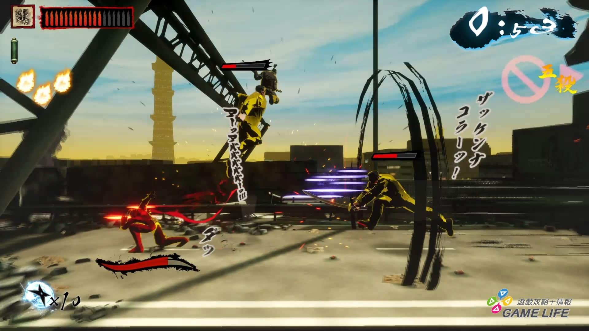 不過因為作為 2D 橫向捲軸,在關卡設計上有挑戰性,也不會說難度設計到太過份,只要願意反覆嘗試跟仔細觀察,都能找到攻略手段,就只差在玩家本身對遊戲節奏的反應能力了。也因此筆者才會說,《忍者殺手 火燒新埼玉》也是適合喜歡 2D 橫向捲軸的玩家一試,甚至可以趁這機會認識,《忍者殺手》這個有獨特「錯誤日本風味」的作品。