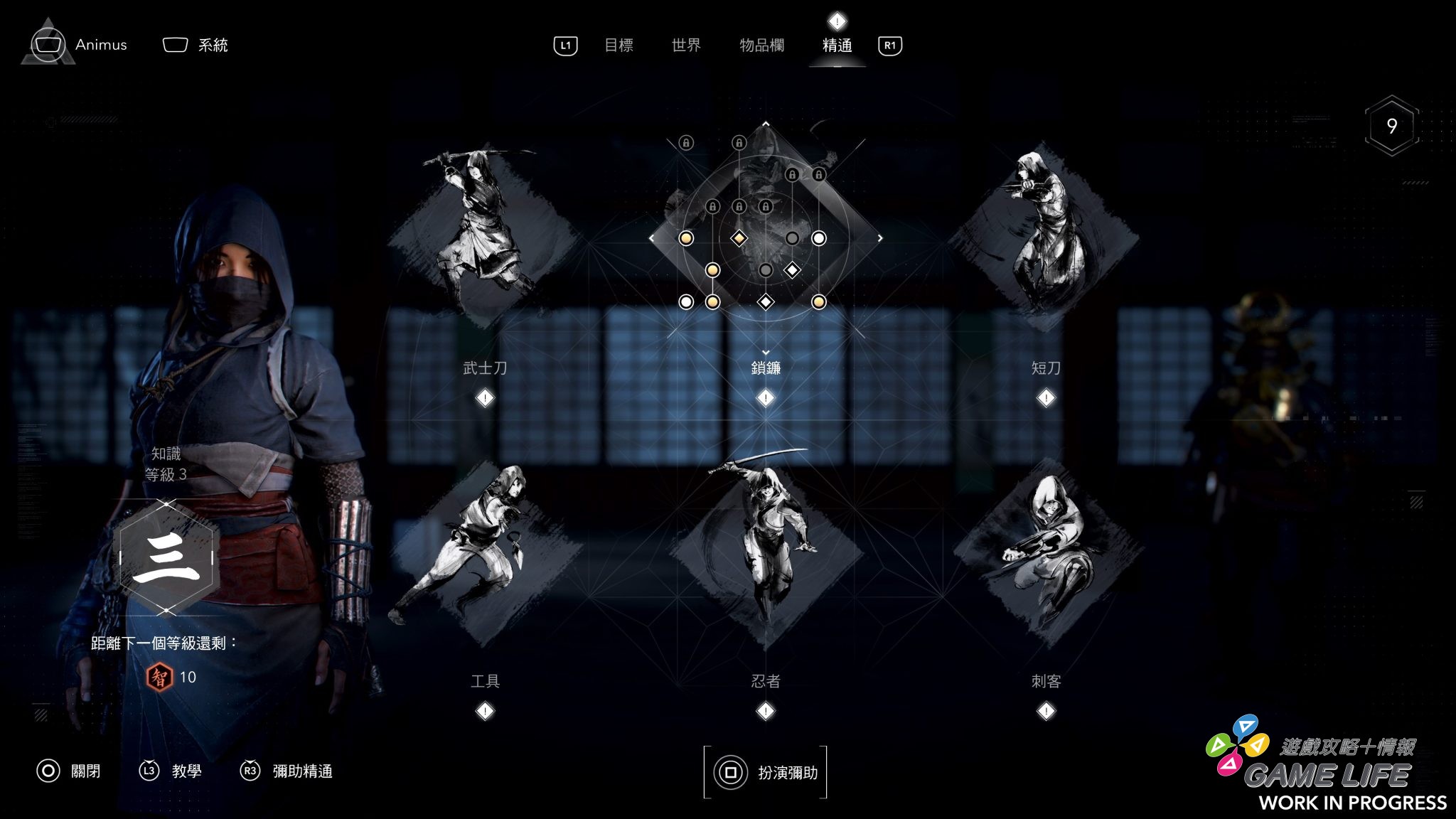 跟至今的《刺客教條》系列相同,玩家的遊戲過程會經歷暗殺潛行、正面戰鬥,更不用說在戰國亂世也是會遇到些不良分子,解決這些戰鬥都會獲得經驗值提升等級、新的裝備來應用。彌助與奈緒江的裝備是分開的,兩者各有自己的戰鬥風格,同樣地也各自擁有自己的技能樹,花費升級獲得的點數來開放各種武器或基礎性能的特技,要注意特技是用複合按鈕來發動,以 PS 手把為例 R1 加四顆紐,但是每個特技能裝在哪顆鈕上是固定的,不一定能將玩家中意的好招都裝好裝滿。
