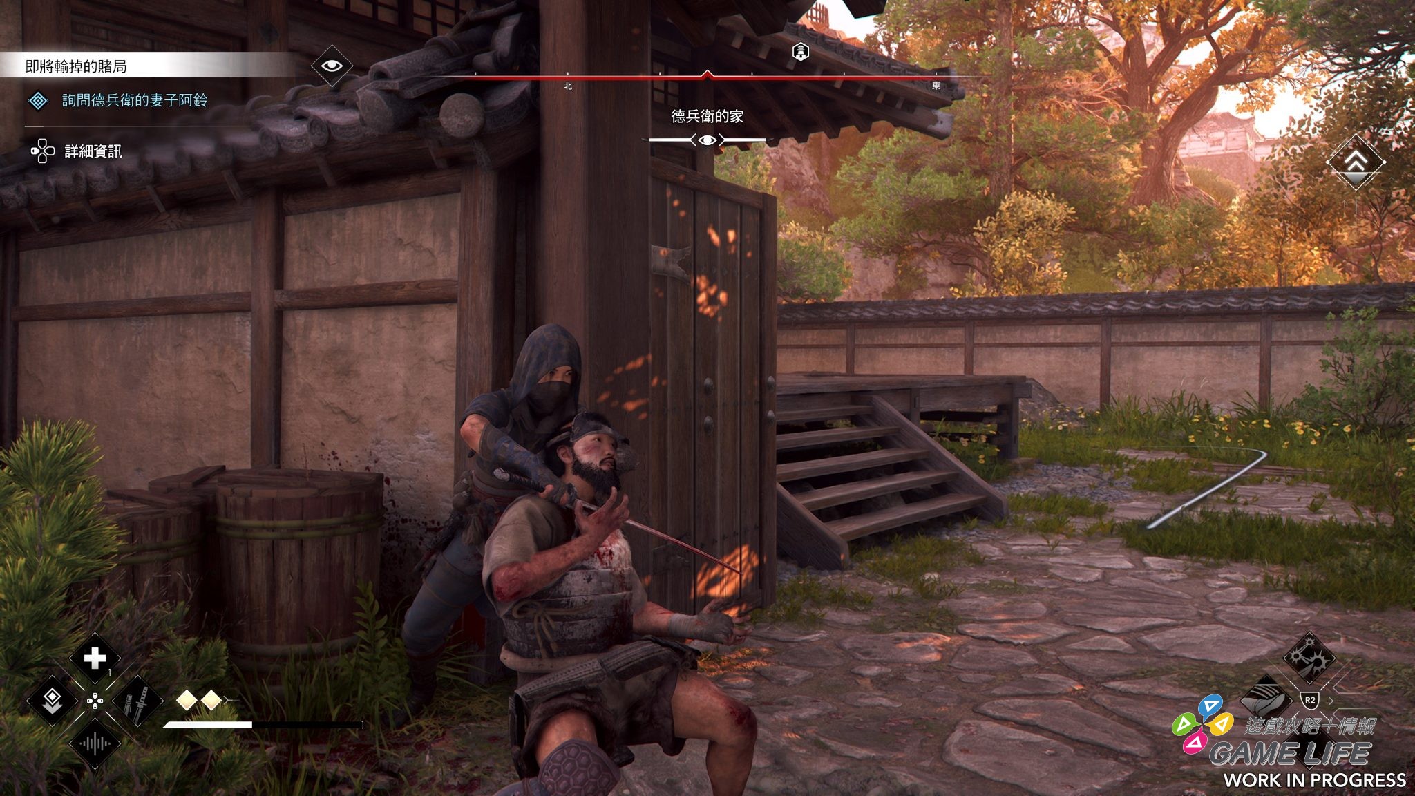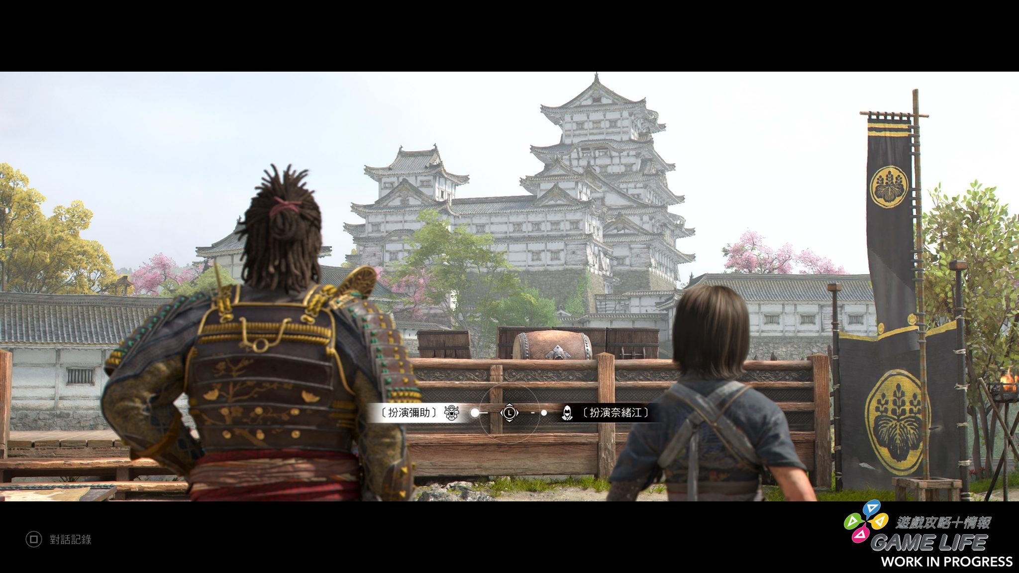 Ubisoft 這次提供試玩的部分主要有序章,了解基礎操作系統同時跟知道彌助與奈緒江的背景,另外一部分是來到播磨幫黑田官兵衛解決宇喜多家發生的問題。本作基本上也是設計成開放世界,玩家操作彌助或奈緒江自由遊蕩於 Ubisoft 打造的日本,本次遊戲重點之一就是兩位主角多數時候其實是兩人一起行動,玩家可以隨時切換操作角色,然後推進事件時會根據玩家當下操作的角色進行對話。在特定事件時兩人會分開行動,這時系統就會特別要求玩家兩人挑選一方來操作,體驗遊戲中安排好的「關卡」。