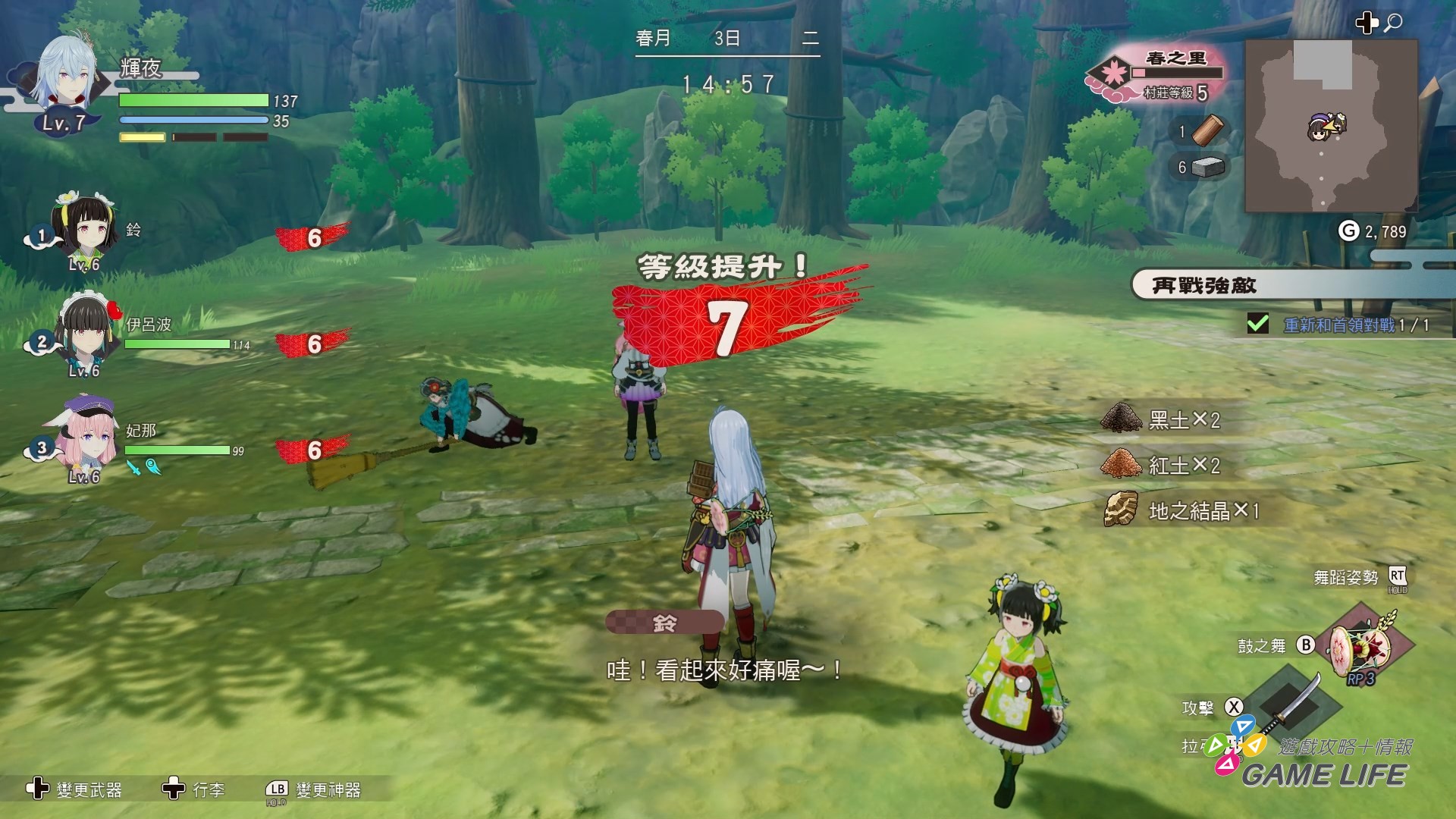 不只如此,舞這個要素關係到屬性跟農務的加速,對降低遊戲難度也有不小的幫助,最簡單好理解的就是屬性要素,本作強敵多半都會有屬性相剋的概念,雖然無視這點也多半有辦法戰勝,但針對敵人的弱點屬性,使用對應的舞,光是能讓強敵暫時無法行動,就能在頭目戰輕鬆很多。