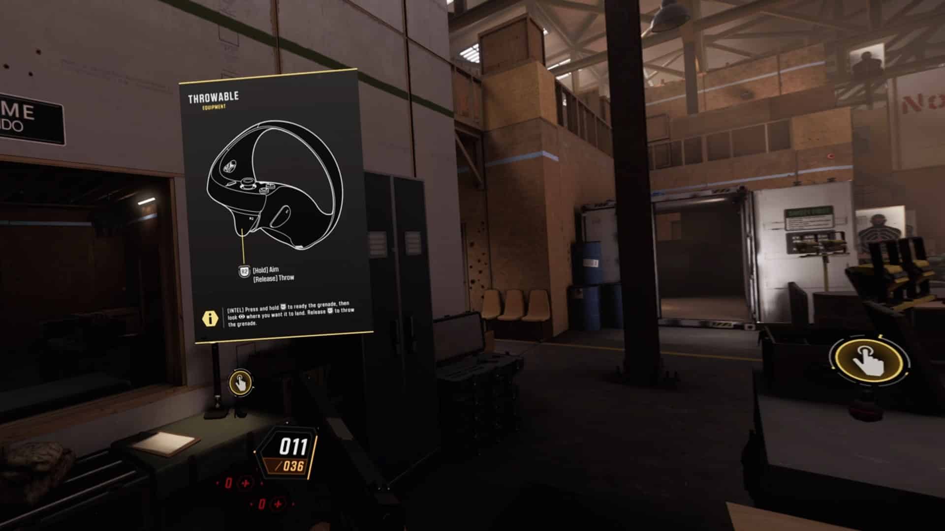 遊戲中會準備幾種槍枝供玩家選擇,也能選擇是否要用手榴彈跟閃光彈。不過這部份筆者就覺得有點小小缺點了,或許是為了加強現實體感,遊戲畫面盡量減少文字或選單說明,但這遊戲基本上說明不足的地方比想像中多,例如一開始找槍架、要去哪裡做什麼、如何開換槍械的選單、怎麼樣裝備其他武器等等,玩家需要一定程度地自行摸索,入門上可能比想像中地還要不方便。