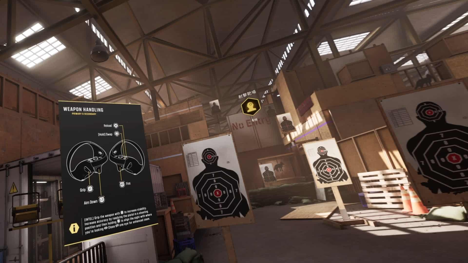 遊戲開始時會進入簡單的教學模式,讓玩家了解這遊戲的設定跟判斷是否要調整 VR 的設定,特別是這遊戲有用到不少視線追蹤的時候,玩家可以用視線觀看關鍵物件或者控制選單挑選,這部份操作也需要點時間習慣。剩下就是基本的 L 類比移動、R 類比切換視角、扣板機射擊等很簡單地操作了。