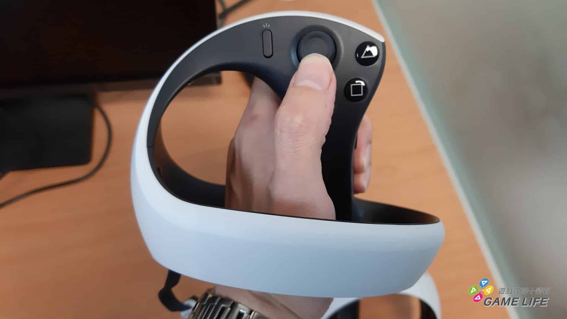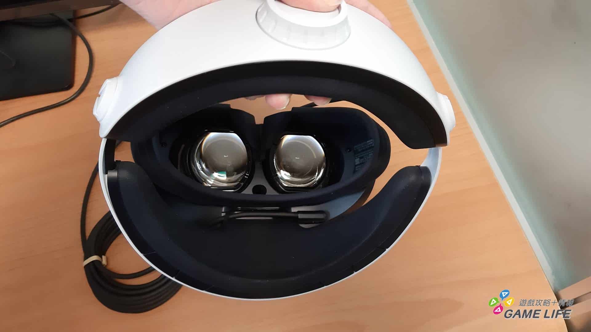 過去 PS VR 一個很大的麻煩之處就是戴上後只看得到遊戲畫面,所以要拿控制器、喝口水等做點小事,還是要把頭套拿下來。這回完全不用,就算戴著 PS VR2 頭套,還是可以看到面前的事物。進行遊戲時,玩家也可以靠頭套前端下方右側的功能鈕來切換遊戲或現實的眼前畫面,這點倒是 VR 設備裡蠻重要的進步。