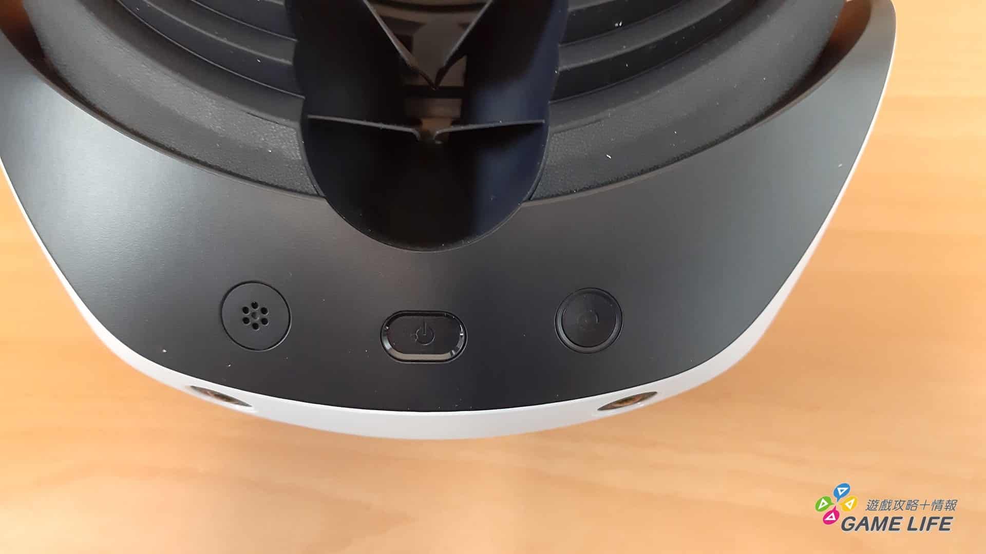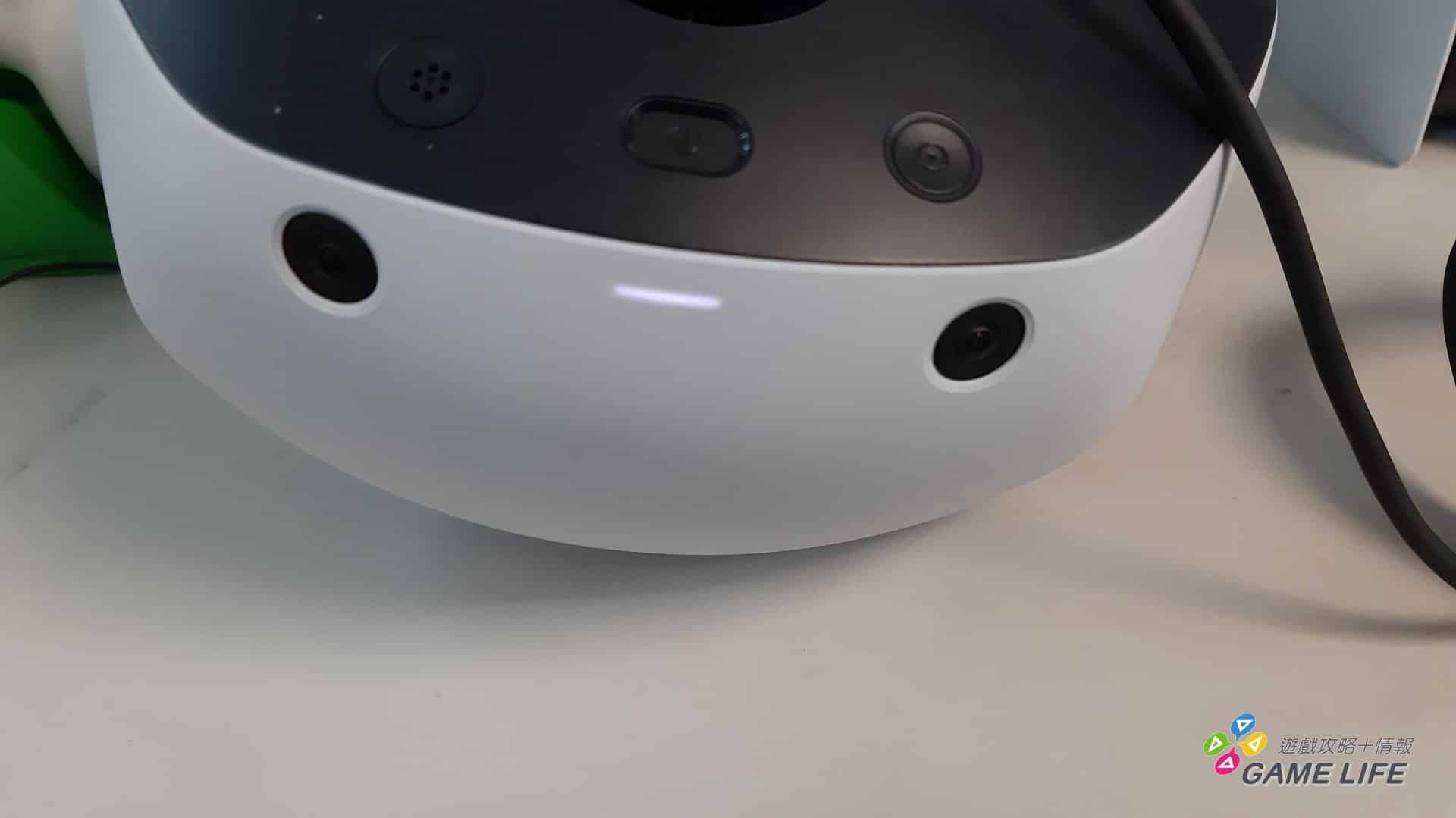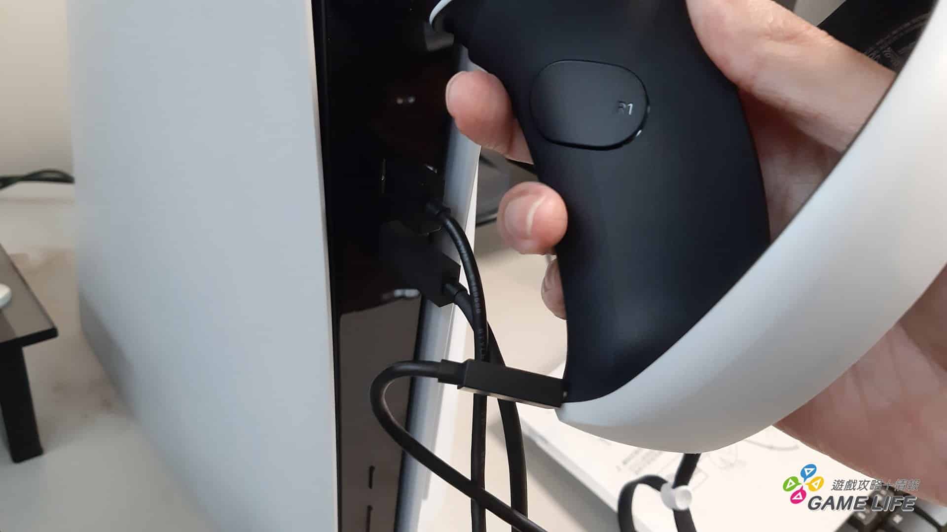 依照指示裝上耳機、手把後,就可以戴上頭套進入進一步的設定。順帶一提,手把連接上 PS5 主機後,底部也有一處會發白光,但要注意兩邊手把都必須連接與充電,沒有另外買專用充電座的話,充電會稍稍麻煩。然後要記住頭套前端下方右側有一顆功能鈕,這顆按鈕還蠻重要的,設定、安裝時會經常用到。
