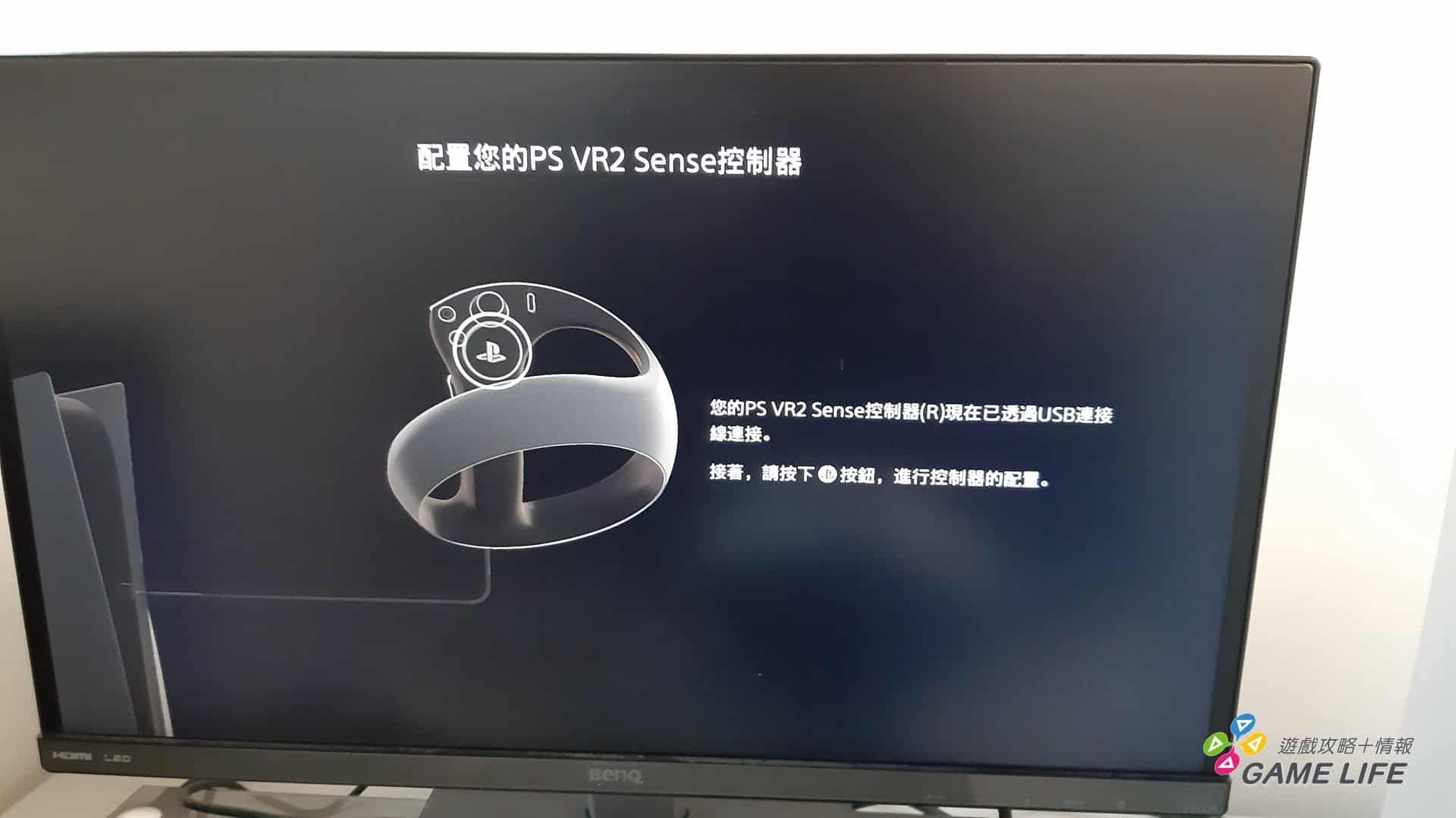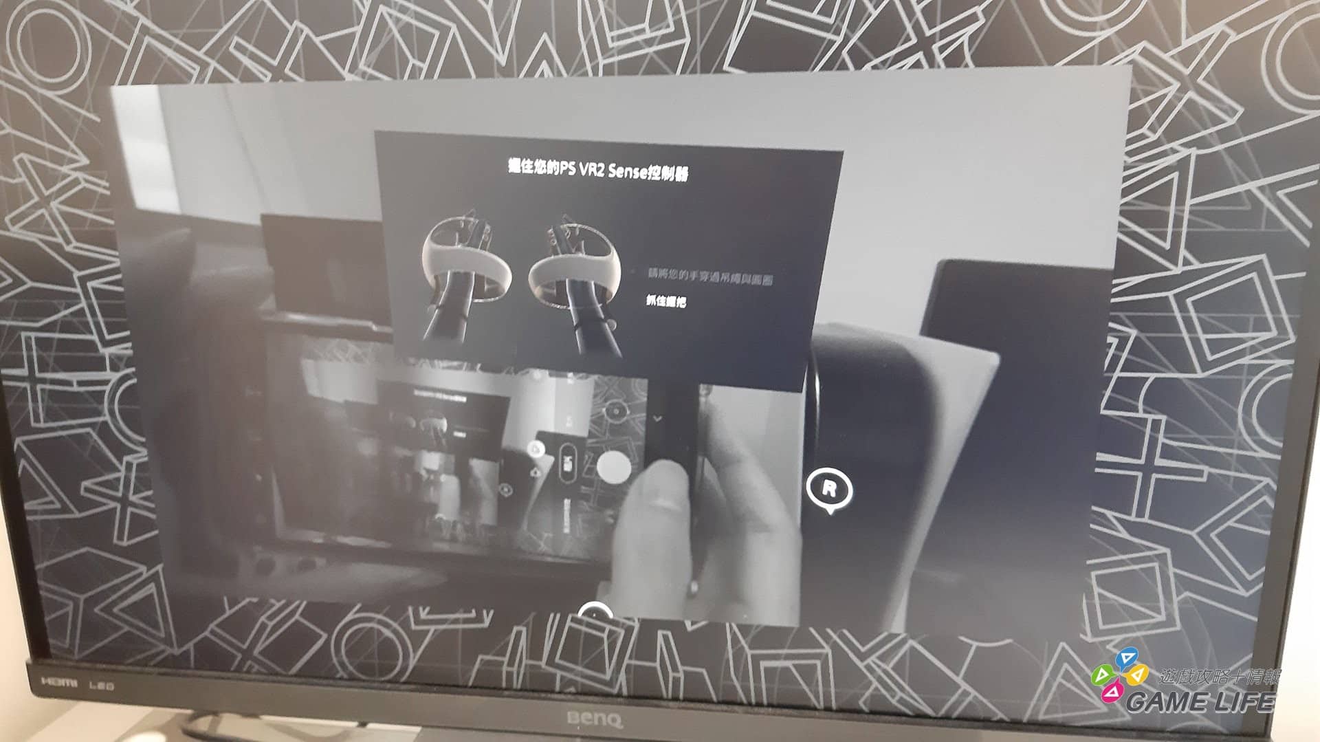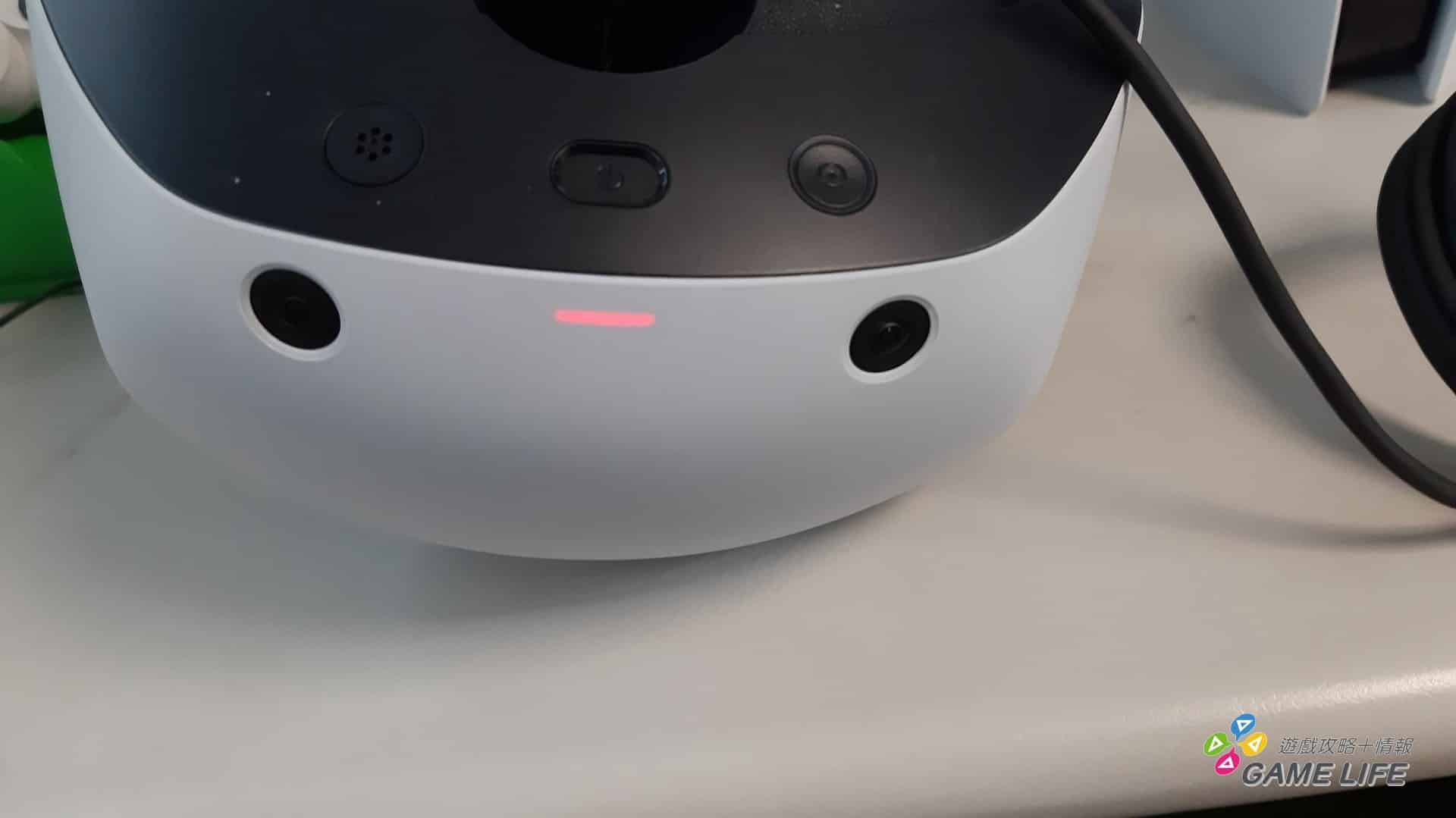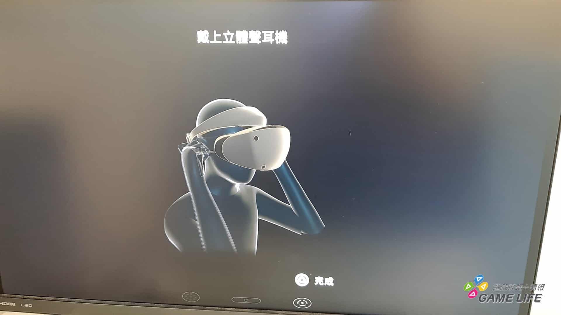 依照指示裝上耳機、手把後,就可以戴上頭套進入進一步的設定。順帶一提,手把連接上 PS5 主機後,底部也有一處會發白光,但要注意兩邊手把都必須連接與充電,沒有另外買專用充電座的話,充電會稍稍麻煩。然後要記住頭套前端下方右側有一顆功能鈕,這顆按鈕還蠻重要的,設定、安裝時會經常用到。